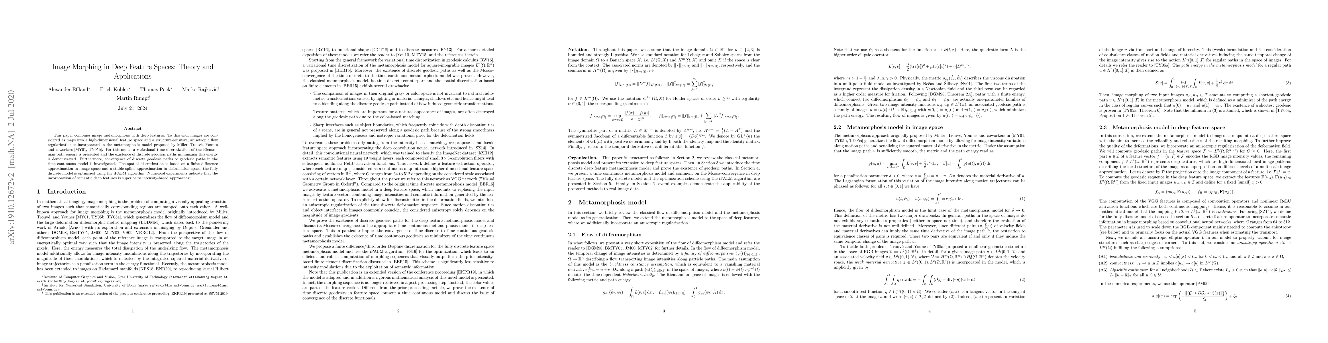 This paper combines image metamorphosis with deep features. To this end, images are considered as maps into a high-dimensional feature space and a structure-sensitive, anisotropic flow regularization is incorporated in the metamorphosis model proposed by Miller, Trouv\'e, Younes and coworkers. For this model a variational time discretization of the Riemannian path energy is presented and the existence of discrete geodesic paths minimizing this energy is demonstrated. Furthermore, convergence of discrete geodesic paths to geodesic paths in the time continuous model is investigated. The spatial discretization is based on a finite difference approximation in image space and a stable spline approximation in deformation space, the fully discrete model is optimized using the iPALM algorithm. Numerical experiments indicate that the incorporation of semantic deep features is superior to intensity-based approaches.
