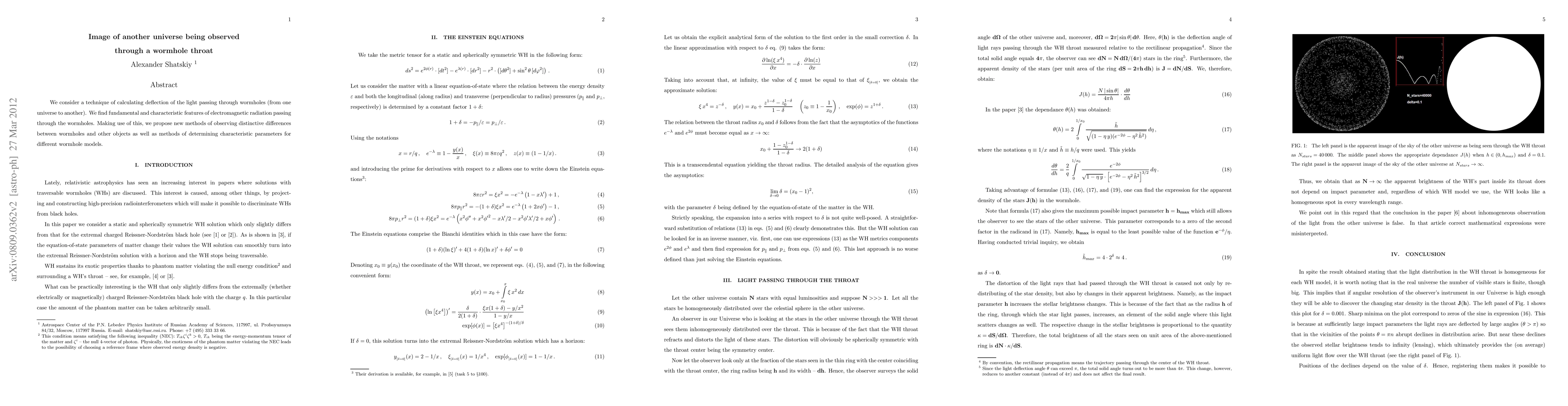 This paper explores the deflection of light through wormholes connecting different universes, identifying unique electromagnetic radiation features. It proposes novel methods to distinguish wormholes from other objects and determine their specific parameters.