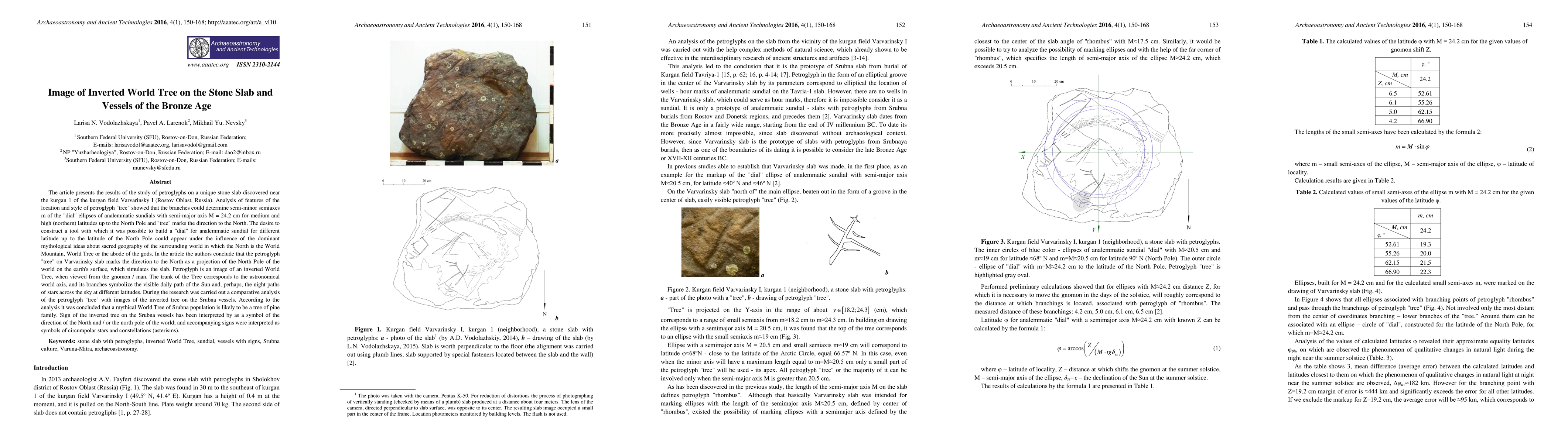 The study of a petroglyph on a stone slab near Varvarinsky I kurgan field reveals an inverted World Tree marking the North, symbolizing the World Mountain and the North Pole. Comparative analysis with Srubna vessels suggests the inverted tree symbolizes the North and the pine family tree, with accompanying signs representing circumpolar stars and constellations.