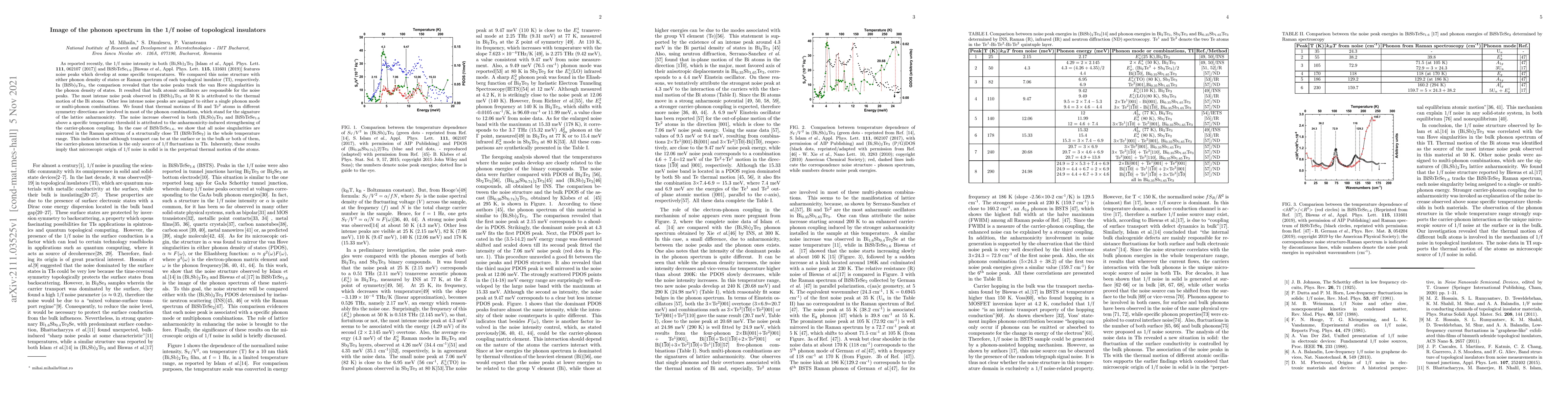 As reported recently, the 1/f noise intensity in both (Bi,Sb)2Te3 [Islam et al., Appl. Phys. Lett. 111, 062107 (2017)] and BiSbTeSe1.6 [Biswas et al., Appl. Phys. Lett. 115, 131601 (2019)] features noise peaks which develop at some specific temperatures. We compared this noise structure with either phonon density of states or Raman spectrum of each topological insulator (TI), respectively. In (BiSb)2Te3, the comparison revealed that the noise peaks track the van Hove singularities in the phonon density of states. It resulted that bulk atomic oscillators are responsible for the noise peaks. The most intense noise peak observed in (BiSb)2Te3 at 50 K is attributed to the thermal motion of the Bi atoms. Other less intense noise peaks are assigned to either a single phonon mode or multi-phonon combinations. We found that thermal motions of Bi and Te2 atoms in different symmetry directions are involved in most of the phonon combinations, which stand for the signature of the lattice anharmonicity. The noise increase observed in both (Bi,Sb)2Te3 and BiSbTeSe1.6 above a specific temperature threshold is attributed to the anharmonicity-induced strengthening of the carrier-phonon coupling. In the case of BiSbTeSe1.6, we show that all noise singularities are mirrored in the Raman spectrum of a structurally close TI (BiSbTeSe2) in the whole temperature range. This indicates that although transport can be at the surface or in the bulk or both of them, the carrier-phonon interaction is the only source of 1/f fluctuations in TIs. Inherently, these results imply that microscopic origin of 1/f noise in solid is in the perpetual thermal motion of the atoms.