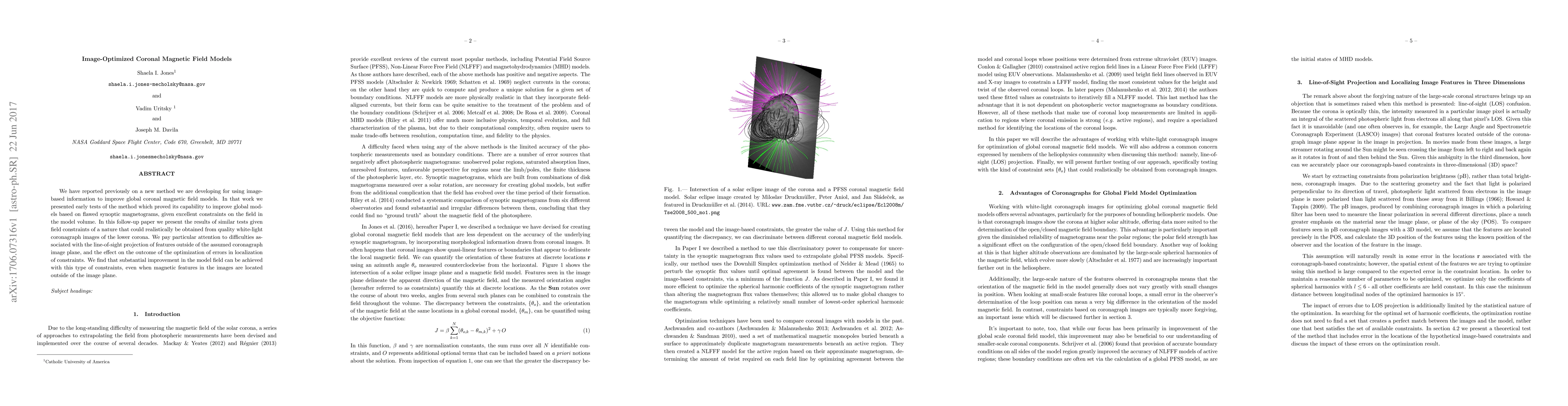 This paper refines a method for enhancing global coronal magnetic field models using image-based data, demonstrating significant improvements even when magnetic features are outside the image plane. The study addresses challenges related to projection and localization errors, showing promising results from realistic constraints derived from white-light coronagraph images.