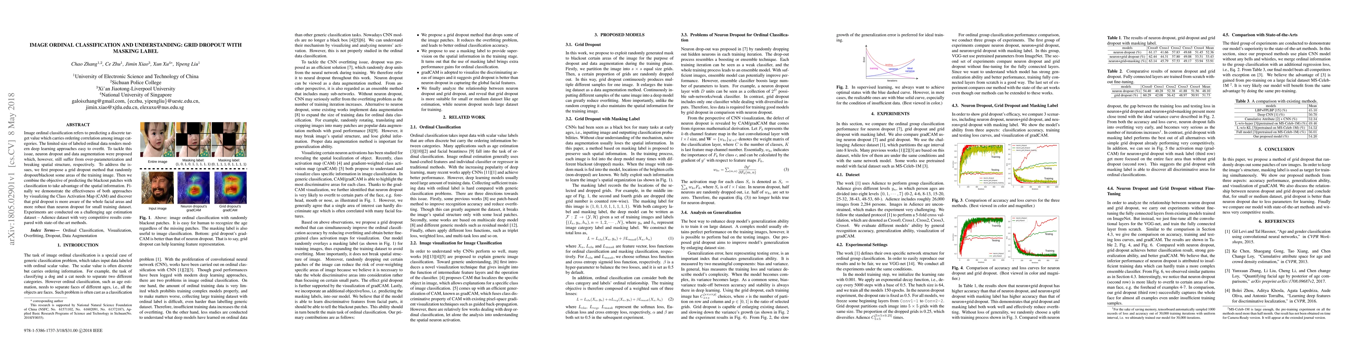Image ordinal classification refers to predicting a discrete target value which carries ordering correlation among image categories. The limited size of labeled ordinal data renders modern deep learning approaches easy to overfit. To tackle this issue, neuron dropout and data augmentation were proposed which, however, still suffer from over-parameterization and breaking spatial structure, respectively. To address the issues, we first propose a grid dropout method that randomly dropout/blackout some areas of the raining image. Then we combine the objective of predicting the blackout patches with classification to take advantage of the spatial information. Finally we demonstrate the effectiveness of both approaches by visualizing the Class Activation Map (CAM) and discover that grid dropout is more aware of the whole facial areas and more robust than neuron dropout for small training dataset. Experiments are conducted on a challenging age estimation dataset - Adience dataset with very competitive results compared with state-of-the-art methods.