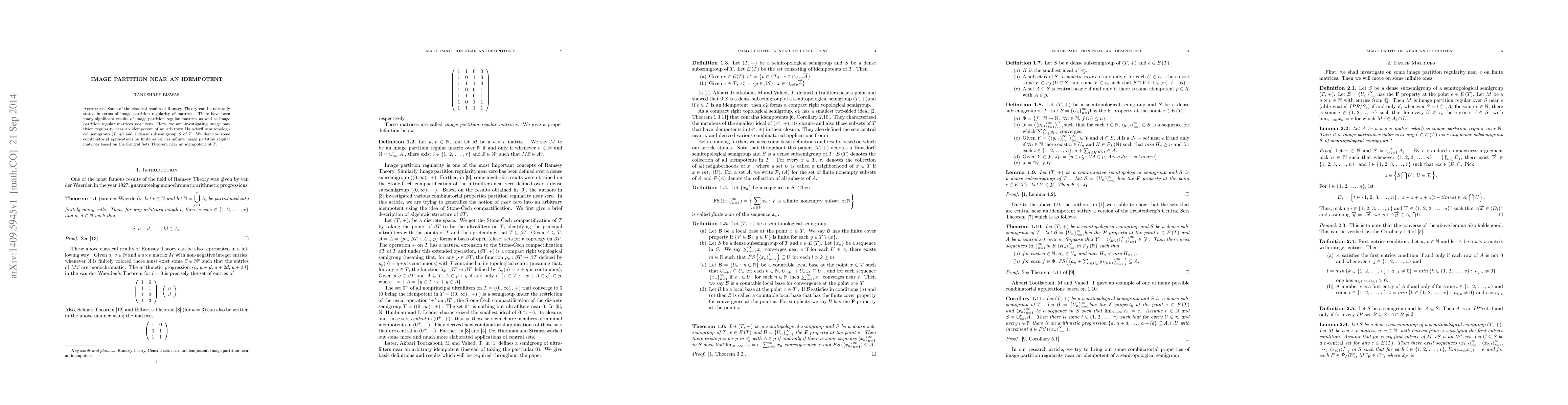 Researchers investigate image partition regularity near an idempotent of a semigroup, revealing combinatorial applications for finite and infinite matrices.