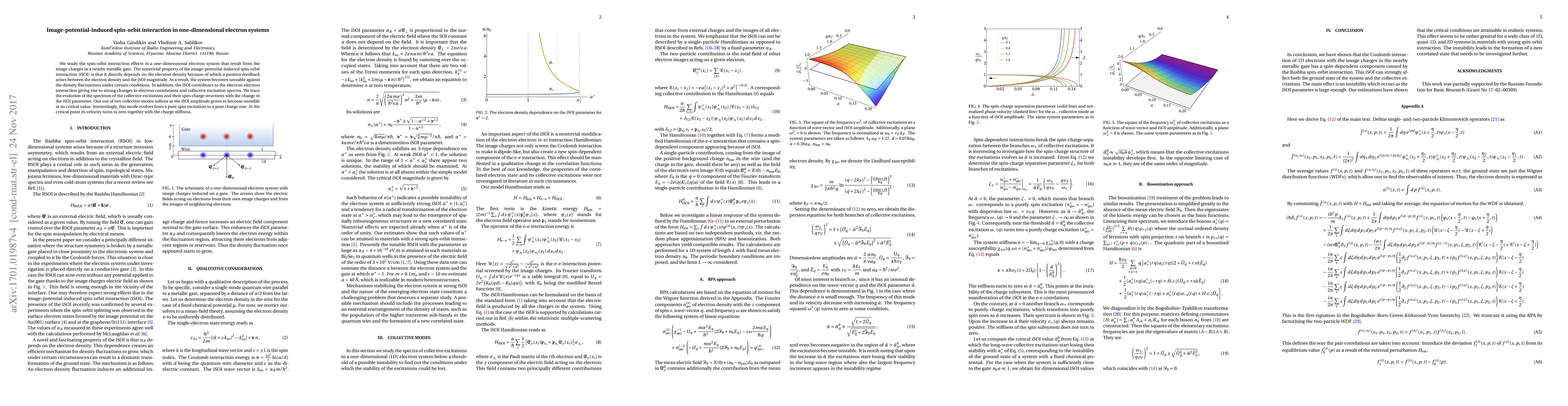 We study the spin-orbit interaction effects in a one-dimensional electron system that result from the image charges in a nearby metallic gate. The nontrivial property of the image-potential-induced spin-orbit interaction (iSOI) is that it directly depends on the electron density because of which a positive feedback arises between the electron density and the iSOI magnitude. As a result, the system becomes unstable against the density fluctuations under certain conditions. In addition, the iSOI contributes to the electron-electron interaction giving rise to strong changes in electron correlations and collective excitation spectra. We trace the evolution of the spectrum of the collective excitations and their spin-charge structures with the change in the iSOI parameter. One out of two collective modes softens as the iSOI amplitude grows to become unstable at its critical value. Interestingly, this mode evolves from a pure spin excitation to a pure charge one. At the critical point its velocity turns to zero together with the charge stiffness.