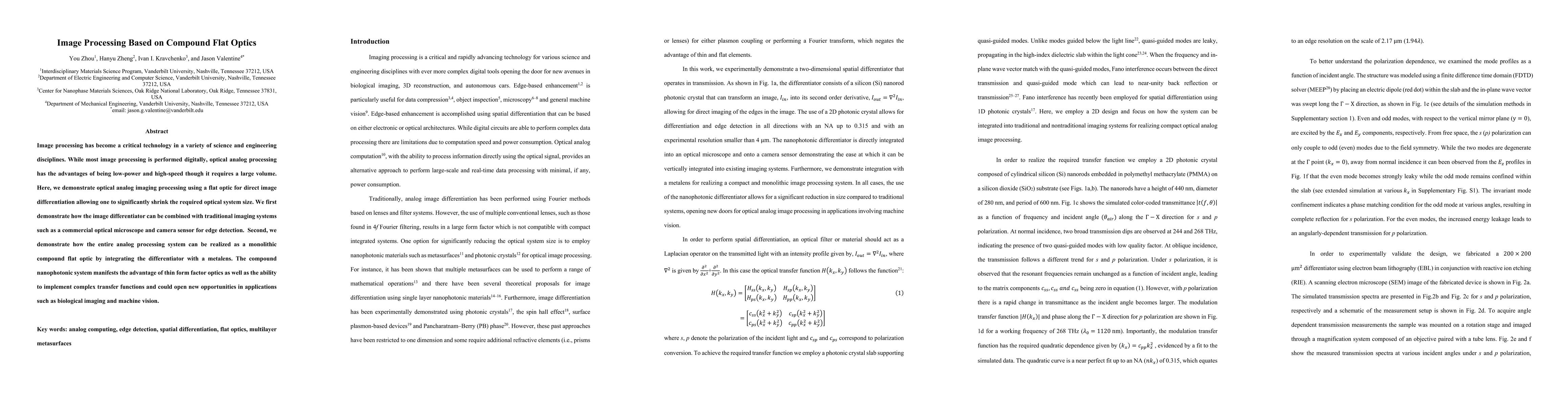 This paper demonstrates optical analog image processing using compound flat optics to achieve low-power, high-speed imaging, shrinking system size. It shows integration of an image differentiator with a metalens to create a monolithic compound flat optic for edge detection and complex transfer functions, promising applications in biological imaging and machine vision.