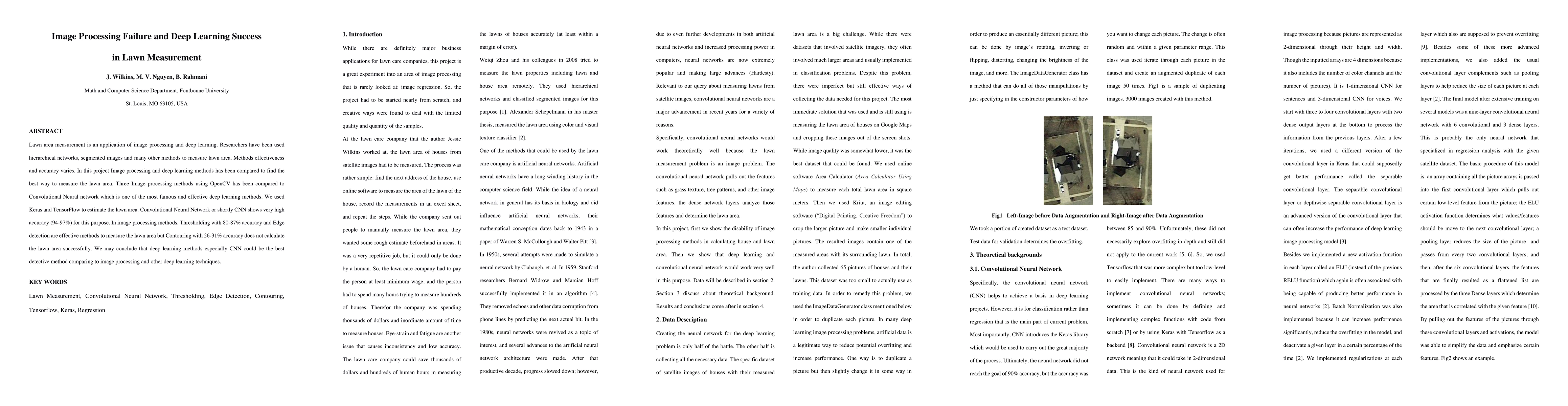 This research compares various methods for measuring lawn area, focusing on the effectiveness of image processing techniques versus deep learning, specifically Convolutional Neural Networks (CNN). The study found that while image processing methods like thresholding and edge detection achieved 80-87% accuracy, CNNs demonstrated significantly higher accuracy, ranging from 94-97%. Thus, deep learning, particularly CNNs, appears to be the most effective approach for this task.