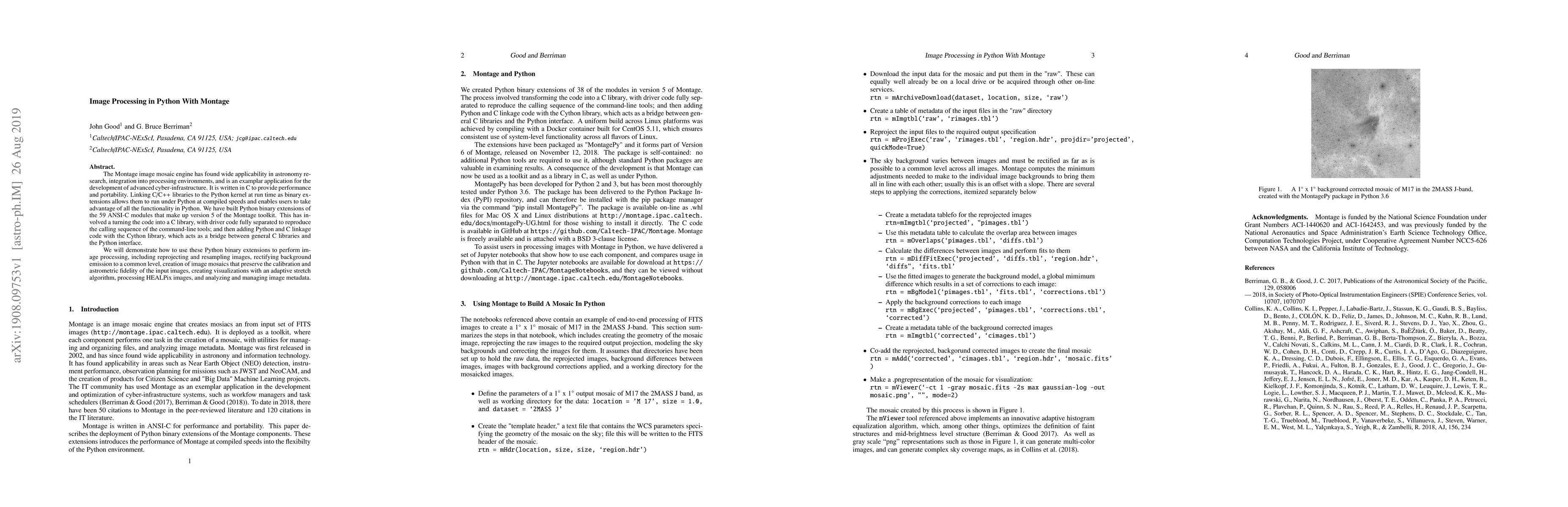 The paper details the development of Python binary extensions for the Montage image mosaic engine, enabling high-performance image processing tasks in astronomy, including reprojection, mosaic creation, and metadata management, leveraging Cython for C/Python integration.