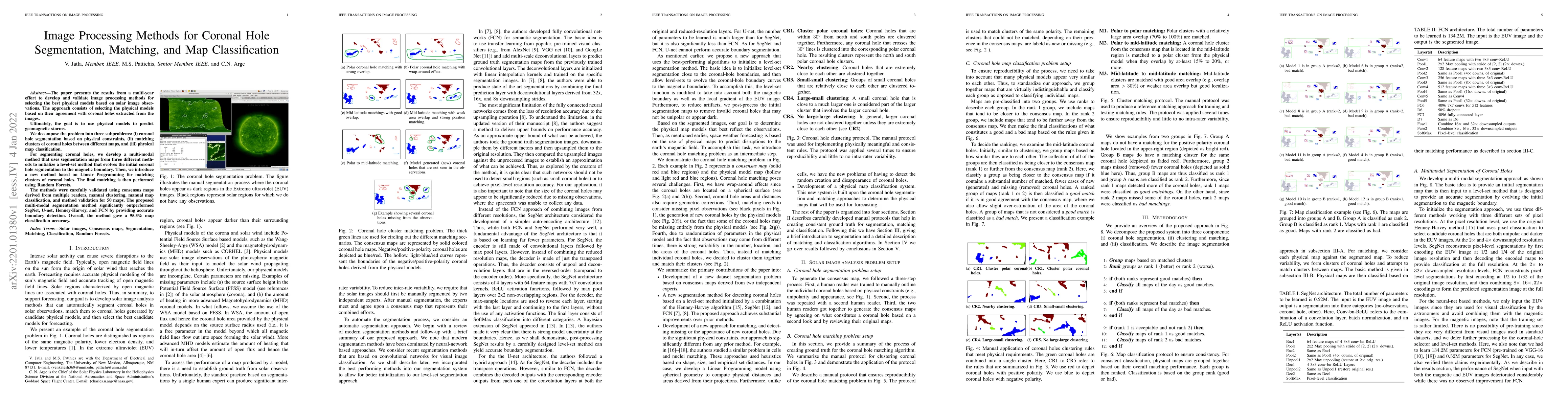 The paper presents the results from a multi-year effort to develop and validate image processing methods for selecting the best physical models based on solar image observations. The approach consists of selecting the physical models based on their agreement with coronal holes extracted from the images. Ultimately, the goal is to use physical models to predict geomagnetic storms. We decompose the problem into three subproblems: (i) coronal hole segmentation based on physical constraints, (ii) matching clusters of coronal holes between different maps, and (iii) physical map classification. For segmenting coronal holes, we develop a multi-modal method that uses segmentation maps from three different methods to initialize a level-set method that evolves the initial coronal hole segmentation to the magnetic boundary. Then, we introduce a new method based on Linear Programming for matching clusters of coronal holes. The final matching is then performed using Random Forests. The methods were carefully validated using consensus maps derived from multiple readers, manual clustering, manual map classification, and method validation for 50 maps. The proposed multi-modal segmentation method significantly outperformed SegNet, U-net, Henney-Harvey, and FCN by providing accurate boundary detection. Overall, the method gave a 95.5% map classification accuracy.