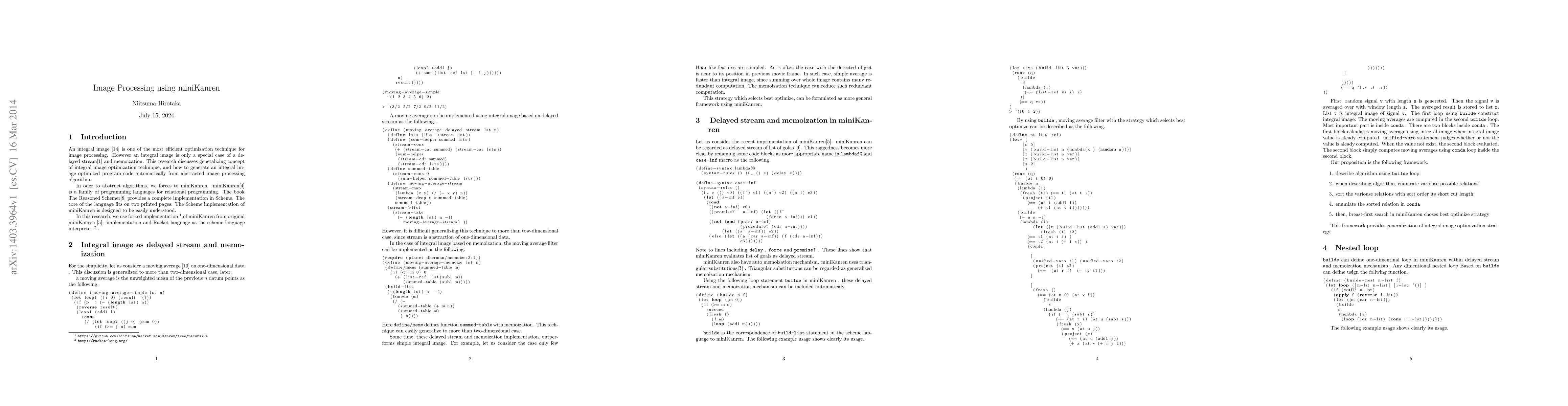 An integral image is one of the most efficient optimization technique for image processing. However an integral image is only a special case of delayed stream or memoization. This research discusses generalizing concept of integral image optimization technique, and how to generate an integral image optimized program code automatically from abstracted image processing algorithm. In oder to abstruct algorithms, we forces to miniKanren.