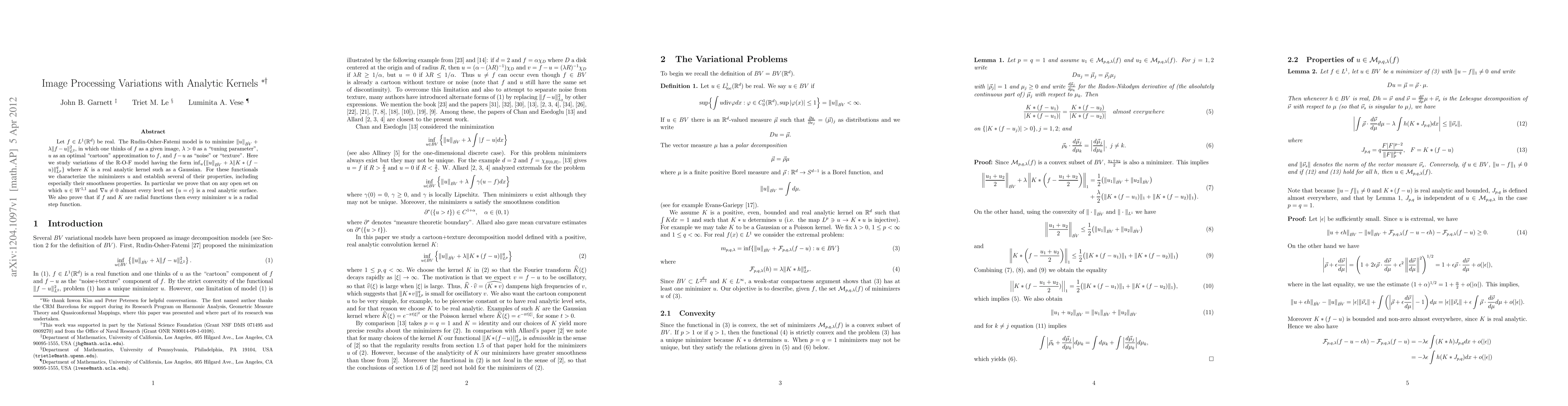 Let $f\in L^1(\R^d)$ be real. The Rudin-Osher-Fatemi model is to minimize $\|u\|_{\dot{BV}}+\lambda\|f-u\|_{L^2}^2$, in which one thinks of $f$ as a given image, $\lambda > 0$ as a "tuning parameter", $u$ as an optimal "cartoon" approximation to $f$, and $f-u$ as "noise" or "texture". Here we study variations of the R-O-F model having the form $\inf_u\{\|u\|_{\dot{BV}}+\lambda \|K*(f-u)\|_{L^p}^q\}$ where $K$ is a real analytic kernel such as a Gaussian. For these functionals we characterize the minimizers $u$ and establish several of their properties, including especially their smoothness properties. In particular we prove that on any open set on which $u \in W^{1,1}$ and $\nabla u \neq 0$ almost every level set $\{u =c\}$ is a real analytic surface. We also prove that if $f$ and $K$ are radial functions then every minimizer $u$ is a radial step function.