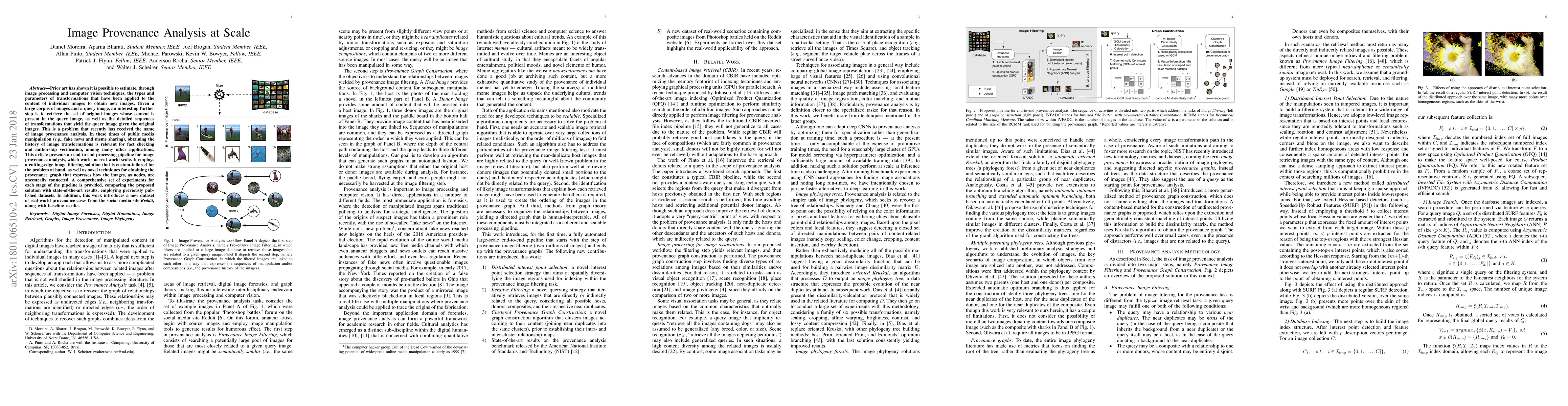 This paper proposes an end-to-end pipeline for image provenance analysis at scale, utilizing advanced image processing and computer vision techniques to trace transformations and retrieve original images from a query. The method is validated against state-of-the-art results and supplemented with a new dataset from Reddit.