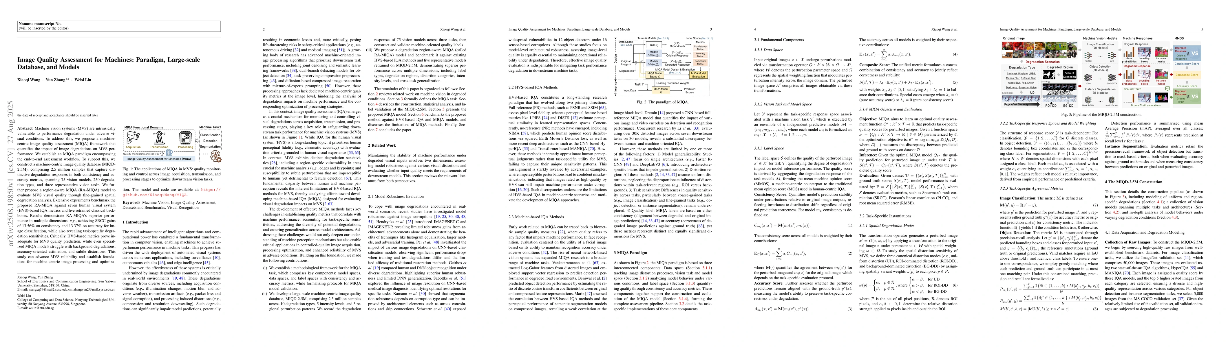 Machine vision systems (MVS) are intrinsically vulnerable to performance degradation under adverse visual conditions. To address this, we propose a machine-centric image quality assessment (MIQA) framework that quantifies the impact of image degradations on MVS performance. We establish an MIQA paradigm encompassing the end-to-end assessment workflow. To support this, we construct a machine-centric image quality database (MIQD-2.5M), comprising 2.5 million samples that capture distinctive degradation responses in both consistency and accuracy metrics, spanning 75 vision models, 250 degradation types, and three representative vision tasks. We further propose a region-aware MIQA (RA-MIQA) model to evaluate MVS visual quality through fine-grained spatial degradation analysis. Extensive experiments benchmark the proposed RA-MIQA against seven human visual system (HVS)-based IQA metrics and five retrained classical backbones. Results demonstrate RA-MIQA's superior performance in multiple dimensions, e.g., achieving SRCC gains of 13.56% on consistency and 13.37% on accuracy for image classification, while also revealing task-specific degradation sensitivities. Critically, HVS-based metrics prove inadequate for MVS quality prediction, while even specialized MIQA models struggle with background degradations, accuracy-oriented estimation, and subtle distortions. This study can advance MVS reliability and establish foundations for machine-centric image processing and optimization. The model and code are available at: https://github.com/XiaoqiWang/MIQA.