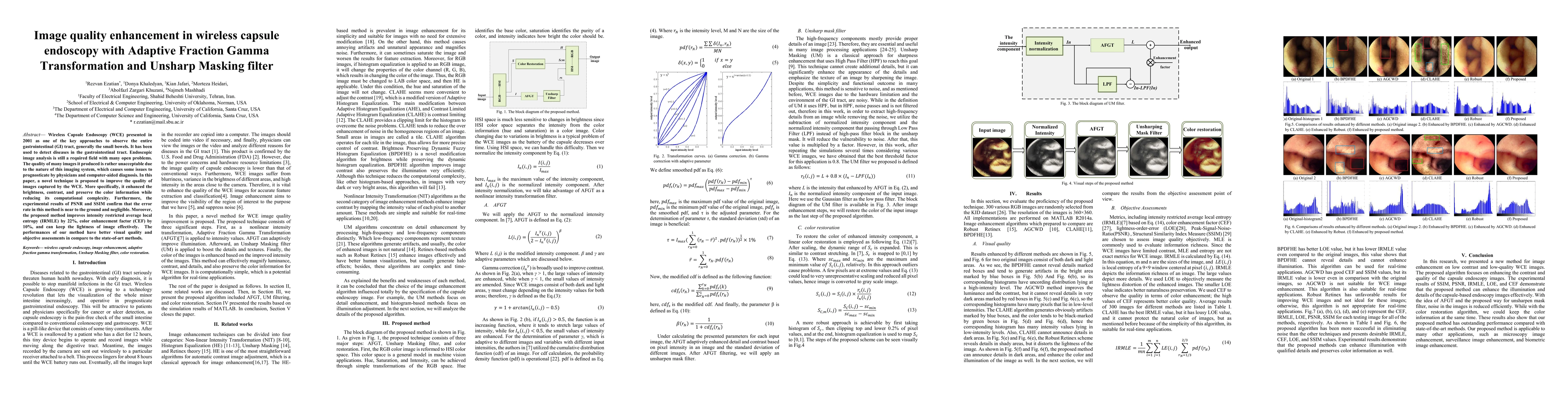 This paper proposes a novel technique using adaptive fraction gamma transformation and unsharp masking filter to enhance the quality of images from Wireless Capsule Endoscopy, improving brightness, contrast, and color preservation while reducing computational complexity. Experimental results show significant improvements in visual quality and objective metrics compared to state-of-the-art methods.