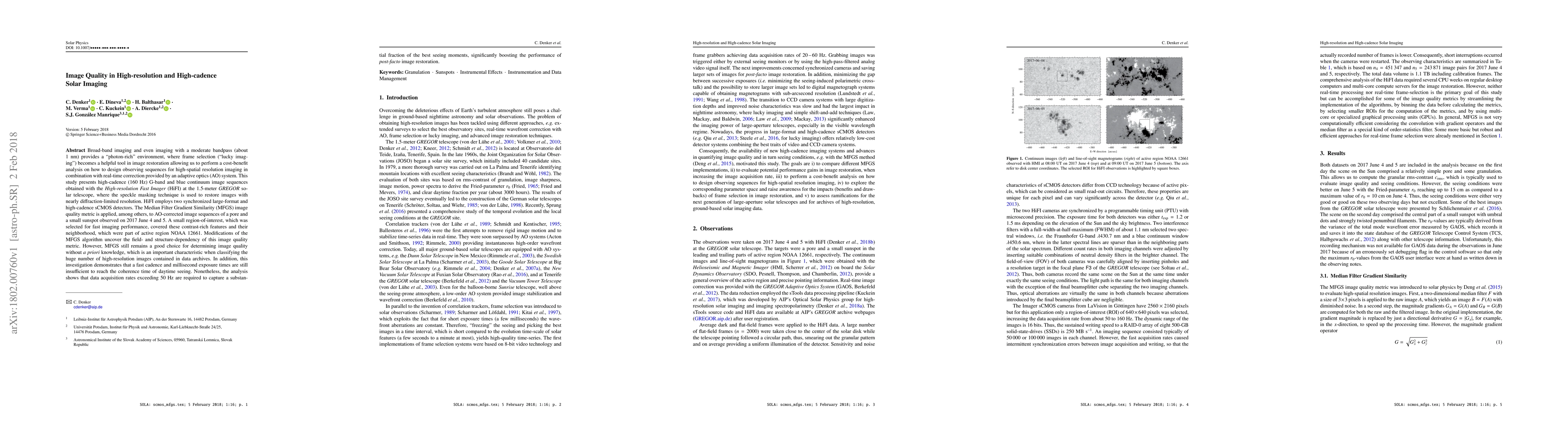 This study investigates high-resolution, high-cadence solar imaging using the High-resolution Fast Imager (HiFI) at the GREGOR solar telescope, employing adaptive optics and speckle masking for image restoration. The Median Filter Gradient Similarity (MFGS) metric is used to assess image quality, revealing that while high data acquisition rates improve image restoration, they do not yet match the coherence time of daytime atmospheric seeing.