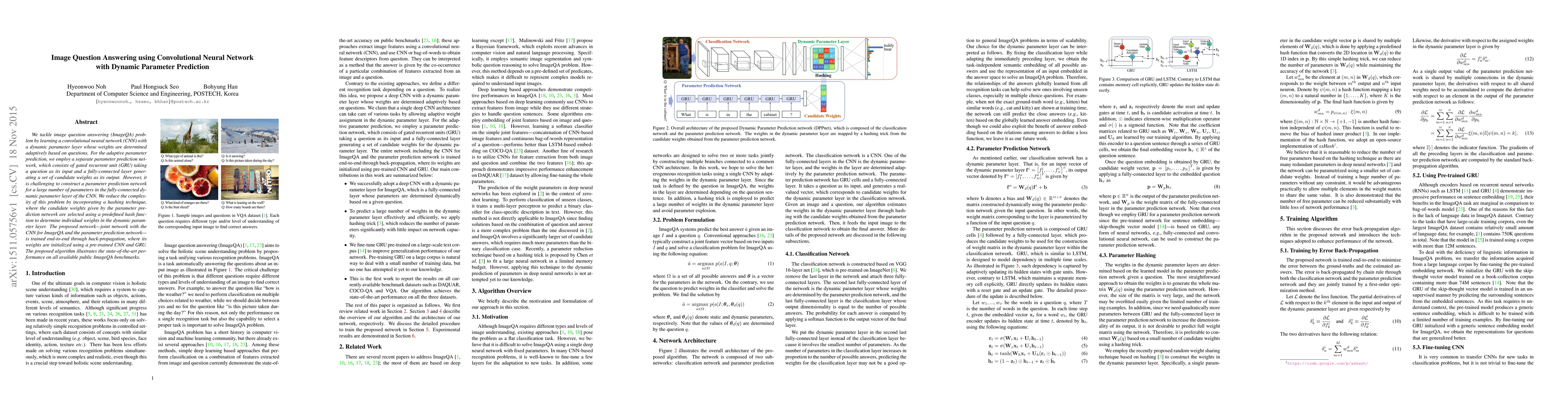 This research proposes a convolutional neural network (CNN) with a dynamic parameter layer for image question answering (ImageQA). The dynamic parameters are adaptively determined based on questions using a parameter prediction network, which reduces complexity through a hashing technique. The joint network achieves state-of-the-art performance on public ImageQA benchmarks.