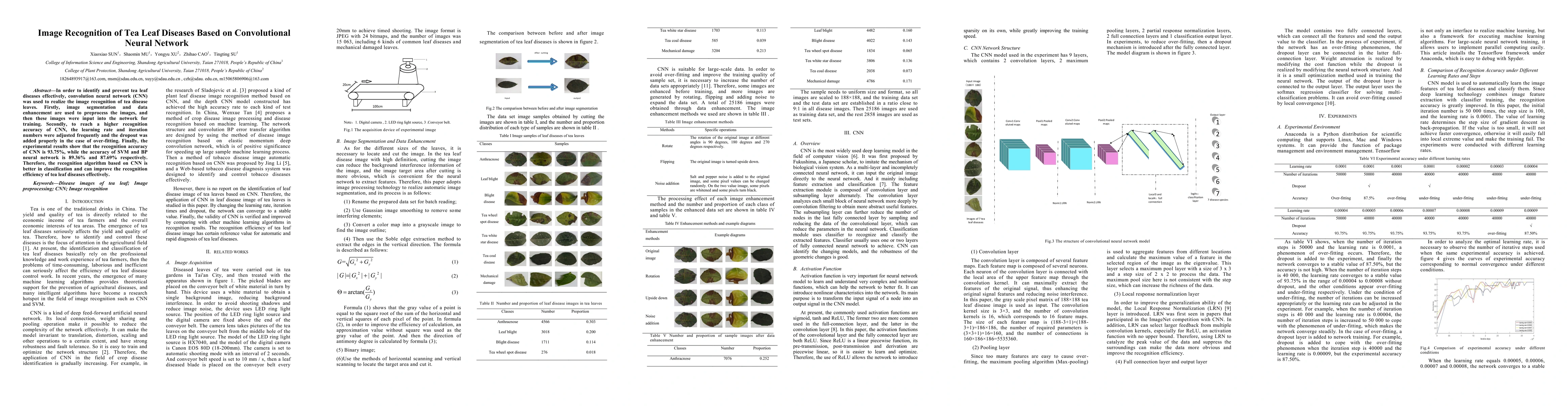 This study employs a convolutional neural network (CNN) to accurately identify tea leaf diseases through image recognition, achieving a recognition accuracy of 93.75%. The CNN model outperformed SVM and BP neural networks, demonstrating improved classification and efficiency in disease detection.