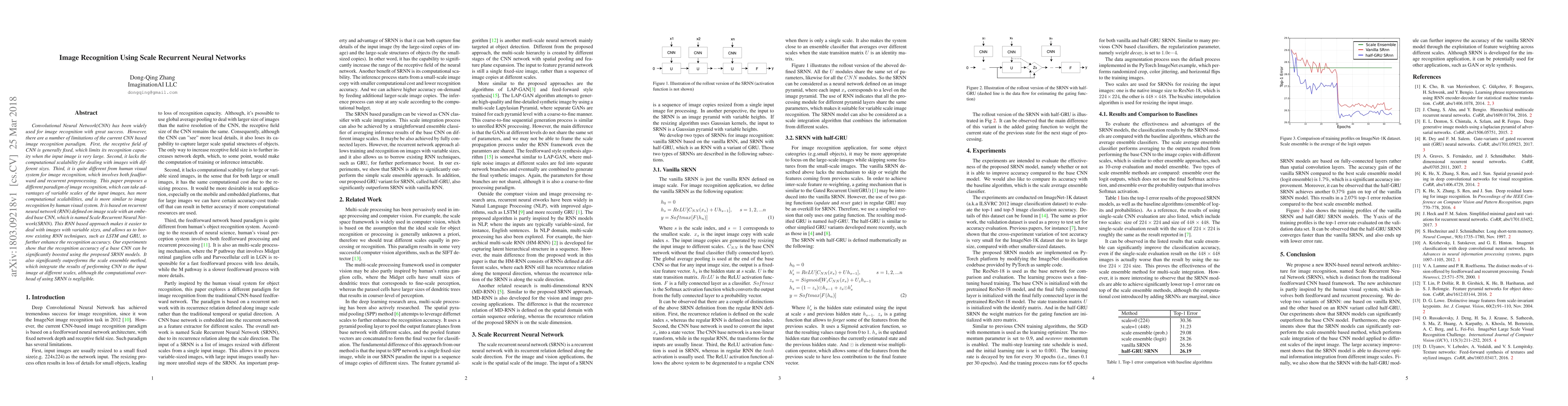 Convolutional Neural Network(CNN) has been widely used for image recognition with great success. However, there are a number of limitations of the current CNN based image recognition paradigm. First, the receptive field of CNN is generally fixed, which limits its recognition capacity when the input image is very large. Second, it lacks the computational scalability for dealing with images with different sizes. Third, it is quite different from human visual system for image recognition, which involves both feadforward and recurrent proprocessing. This paper proposes a different paradigm of image recognition, which can take advantages of variable scales of the input images, has more computational scalabilities, and is more similar to image recognition by human visual system. It is based on recurrent neural network (RNN) defined on image scale with an embeded base CNN, which is named Scale Recurrent Neural Network(SRNN). This RNN based approach makes it easier to deal with images with variable sizes, and allows us to borrow existing RNN techniques, such as LSTM and GRU, to further enhance the recognition accuracy. Our experiments show that the recognition accuracy of a base CNN can be significantly boosted using the proposed SRNN models. It also significantly outperforms the scale ensemble method, which integrate the results of performing CNN to the input image at different scales, although the computational overhead of using SRNN is negligible.
