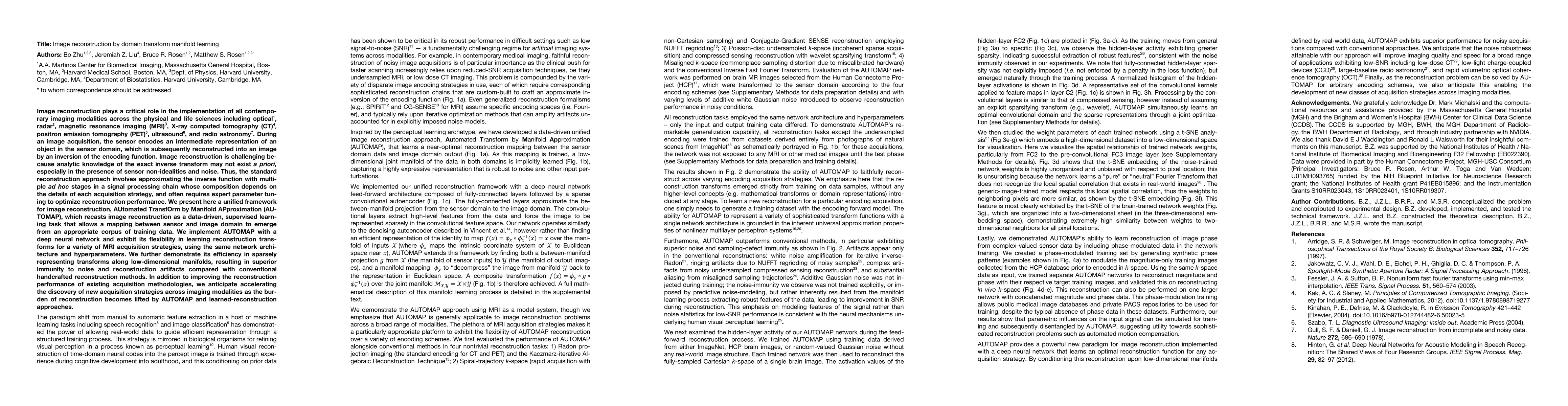 Image reconstruction plays a critical role in the implementation of all contemporary imaging modalities across the physical and life sciences including optical, MRI, CT, PET, and radio astronomy. During an image acquisition, the sensor encodes an intermediate representation of an object in the sensor domain, which is subsequently reconstructed into an image by an inversion of the encoding function. Image reconstruction is challenging because analytic knowledge of the inverse transform may not exist a priori, especially in the presence of sensor non-idealities and noise. Thus, the standard reconstruction approach involves approximating the inverse function with multiple ad hoc stages in a signal processing chain whose composition depends on the details of each acquisition strategy, and often requires expert parameter tuning to optimize reconstruction performance. We present here a unified framework for image reconstruction, AUtomated TransfOrm by Manifold APproximation (AUTOMAP), which recasts image reconstruction as a data-driven, supervised learning task that allows a mapping between sensor and image domain to emerge from an appropriate corpus of training data. We implement AUTOMAP with a deep neural network and exhibit its flexibility in learning reconstruction transforms for a variety of MRI acquisition strategies, using the same network architecture and hyperparameters. We further demonstrate its efficiency in sparsely representing transforms along low-dimensional manifolds, resulting in superior immunity to noise and reconstruction artifacts compared with conventional handcrafted reconstruction methods. In addition to improving the reconstruction performance of existing acquisition methodologies, we anticipate accelerating the discovery of new acquisition strategies across modalities as the burden of reconstruction becomes lifted by AUTOMAP and learned-reconstruction approaches.