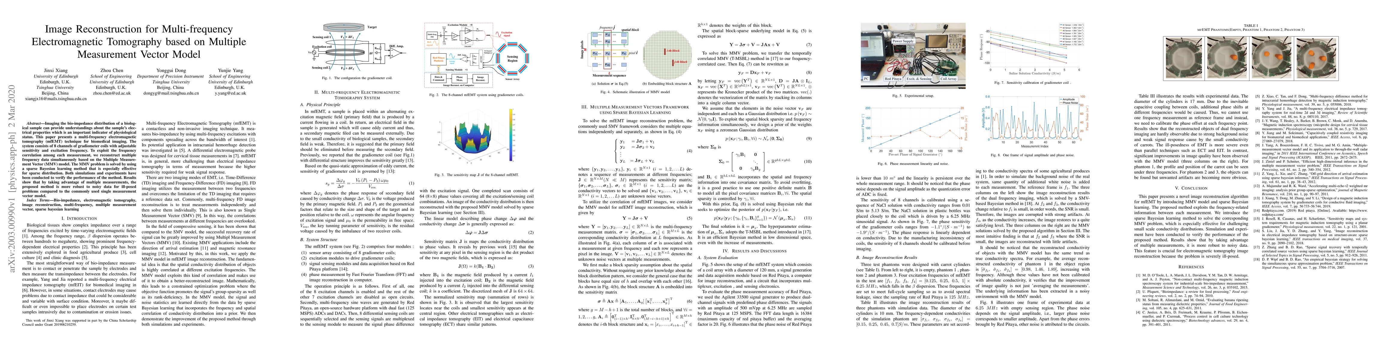 Imaging the bio-impedance distribution of a biological sample can provide understandings about the sample's electrical properties which is an important indicator of physiological status. This paper presents a multi-frequency electromagnetic tomography (mfEMT) technique for biomedical imaging. The system consists of 8 channels of gradiometer coils with adjustable sensitivity and excitation frequency. To exploit the frequency correlation among each measurement, we reconstruct multiple frequency data simultaneously based on the Multiple Measurement Vector (MMV) model. The MMV problem is solved by using a sparse Bayesian learning method that is especially effective for sparse distribution. Both simulations and experiments have been conducted to verify the performance of the method. Results show that by taking advantage of multiple measurements, the proposed method is more robust to noisy data for ill-posed problems compared to the commonly used single measurement vector model.