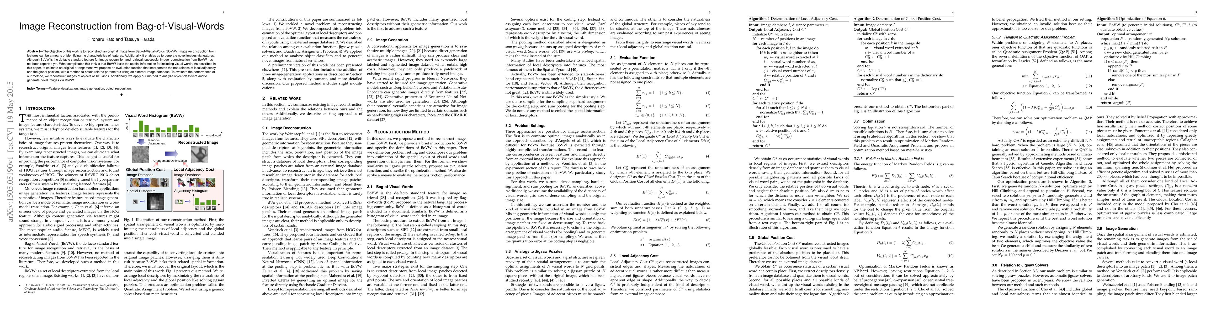 The objective of this work is to reconstruct an original image from Bag-of-Visual-Words (BoVW). Image reconstruction from features can be a means of identifying the characteristics of features. Additionally, it enables us to generate novel images via features. Although BoVW is the de facto standard feature for image recognition and retrieval, successful image reconstruction from BoVW has not been reported yet. What complicates this task is that BoVW lacks the spatial information for including visual words. As described in this paper, to estimate an original arrangement, we propose an evaluation function that incorporates the naturalness of local adjacency and the global position, with a method to obtain related parameters using an external image database. To evaluate the performance of our method, we reconstruct images of objects of 101 kinds. Additionally, we apply our method to analyze object classifiers and to generate novel images via BoVW.