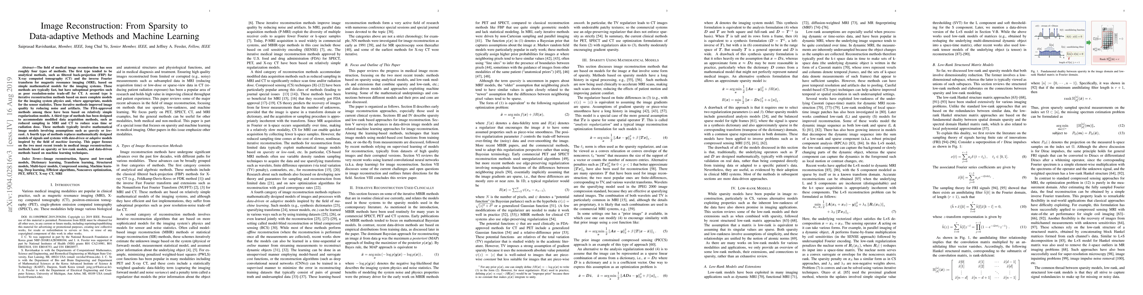 The field of medical image reconstruction has seen roughly four types of methods. The first type tended to be analytical methods, such as filtered back-projection (FBP) for X-ray computed tomography (CT) and the inverse Fourier transform for magnetic resonance imaging (MRI), based on simple mathematical models for the imaging systems. These methods are typically fast, but have suboptimal properties such as poor resolution-noise trade-off for CT. A second type is iterative reconstruction methods based on more complete models for the imaging system physics and, where appropriate, models for the sensor statistics. These iterative methods improved image quality by reducing noise and artifacts. The FDA-approved methods among these have been based on relatively simple regularization models. A third type of methods has been designed to accommodate modified data acquisition methods, such as reduced sampling in MRI and CT to reduce scan time or radiation dose. These methods typically involve mathematical image models involving assumptions such as sparsity or low-rank. A fourth type of methods replaces mathematically designed models of signals and systems with data-driven or adaptive models inspired by the field of machine learning. This paper focuses on the two most recent trends in medical image reconstruction: methods based on sparsity or low-rank models, and data-driven methods based on machine learning techniques.