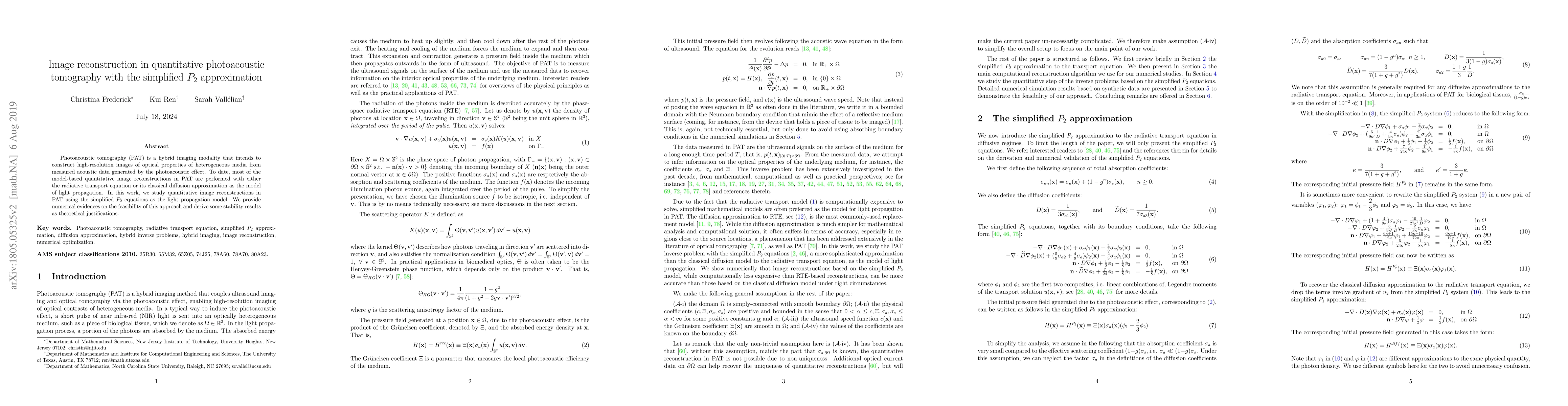 This paper investigates quantitative image reconstruction in photoacoustic tomography (PAT) using the simplified $P_2$ approximation for light propagation. The study provides numerical evidence for the feasibility of this approach and derives theoretical stability results to support it.