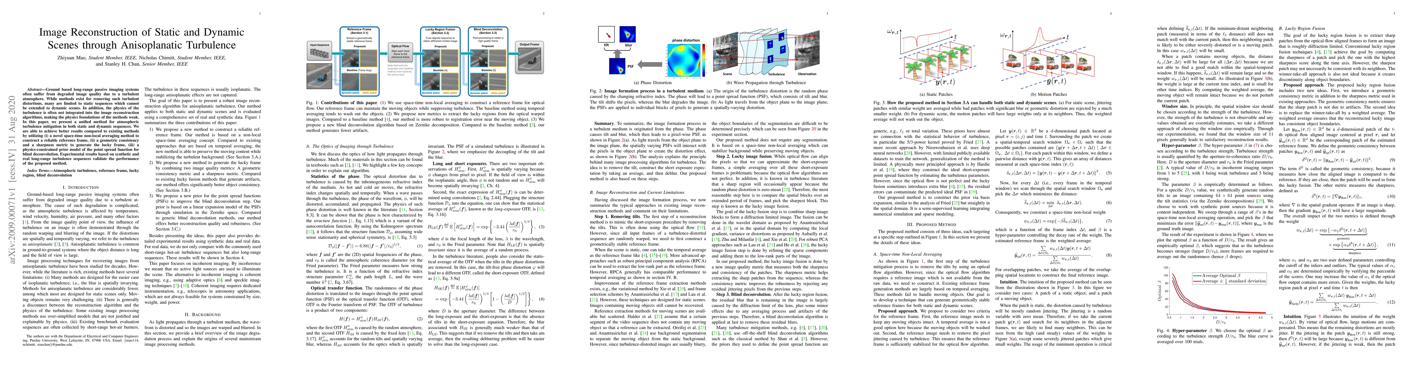 Ground based long-range passive imaging systems often suffer from degraded image quality due to a turbulent atmosphere. While methods exist for removing such turbulent distortions, many are limited to static sequences which cannot be extended to dynamic scenes. In addition, the physics of the turbulence is often not integrated into the image reconstruction algorithms, making the physics foundations of the methods weak. In this paper, we present a unified method for atmospheric turbulence mitigation in both static and dynamic sequences. We are able to achieve better results compared to existing methods by utilizing (i) a novel space-time non-local averaging method to construct a reliable reference frame, (ii) a geometric consistency and a sharpness metric to generate the lucky frame, (iii) a physics-constrained prior model of the point spread function for blind deconvolution. Experimental results based on synthetic and real long-range turbulence sequences validate the performance of the proposed method.