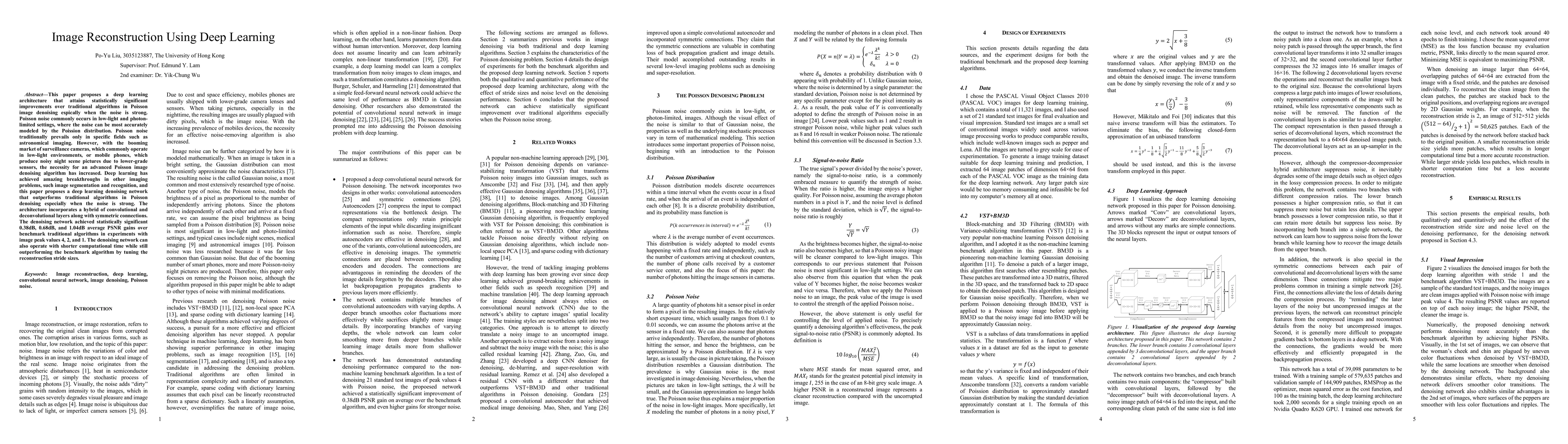 This paper proposes a deep learning architecture that attains statistically significant improvements over traditional algorithms in Poisson image denoising espically when the noise is strong. Poisson noise commonly occurs in low-light and photon- limited settings, where the noise can be most accurately modeled by the Poission distribution. Poisson noise traditionally prevails only in specific fields such as astronomical imaging. However, with the booming market of surveillance cameras, which commonly operate in low-light environments, or mobile phones, which produce noisy night scene pictures due to lower-grade sensors, the necessity for an advanced Poisson image denoising algorithm has increased. Deep learning has achieved amazing breakthroughs in other imaging problems, such image segmentation and recognition, and this paper proposes a deep learning denoising network that outperforms traditional algorithms in Poisson denoising especially when the noise is strong. The architecture incorporates a hybrid of convolutional and deconvolutional layers along with symmetric connections. The denoising network achieved statistically significant 0.38dB, 0.68dB, and 1.04dB average PSNR gains over benchmark traditional algorithms in experiments with image peak values 4, 2, and 1. The denoising network can also operate with shorter computational time while still outperforming the benchmark algorithm by tuning the reconstruction stride sizes.