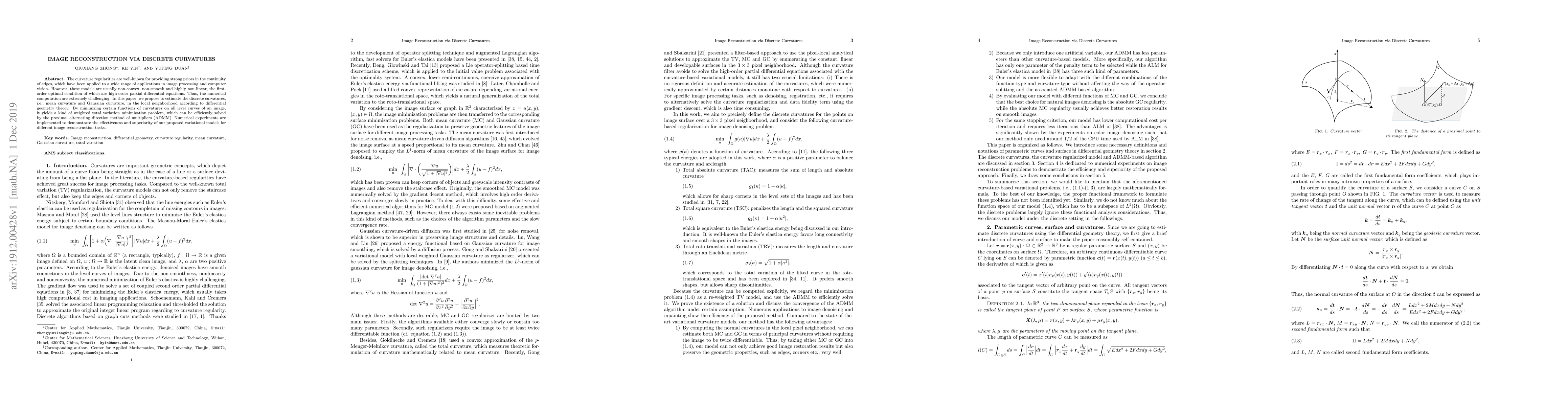 This paper proposes a method to estimate discrete curvatures in image reconstruction, using mean and Gaussian curvature to guide a weighted total variation minimization problem that can be solved efficiently with the proximal ADMM algorithm.