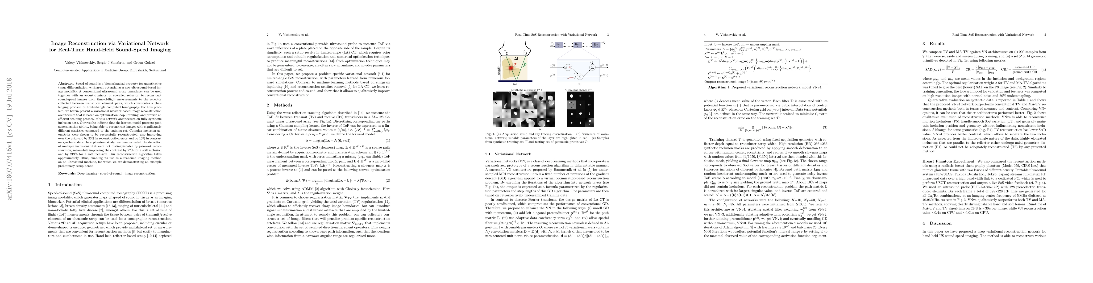 This paper proposes a variational network for real-time hand-held sound-speed imaging, achieving significant improvements in reconstruction accuracy and contrast over prior methods. The network demonstrates good generalization and enables real-time imaging with a 10ms reconstruction time.