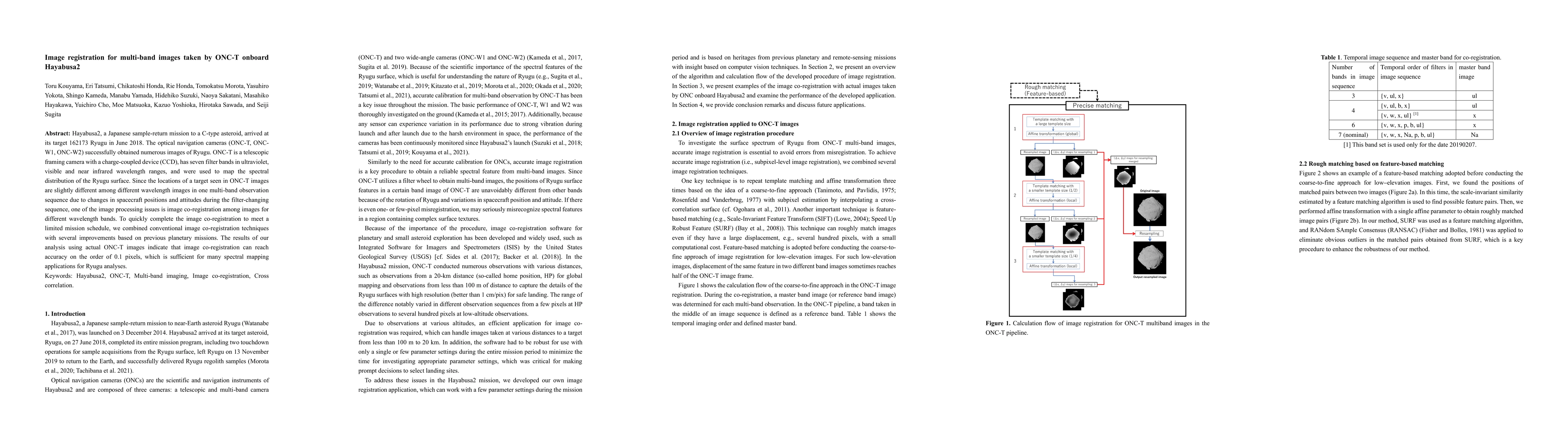 This paper discusses the image registration techniques used to align multi-band images from the ONC-T camera on the Hayabusa2 mission, which captured Ryugu's spectral distribution. The improved registration methods achieved sub-pixel accuracy, essential for spectral analysis of the asteroid.
