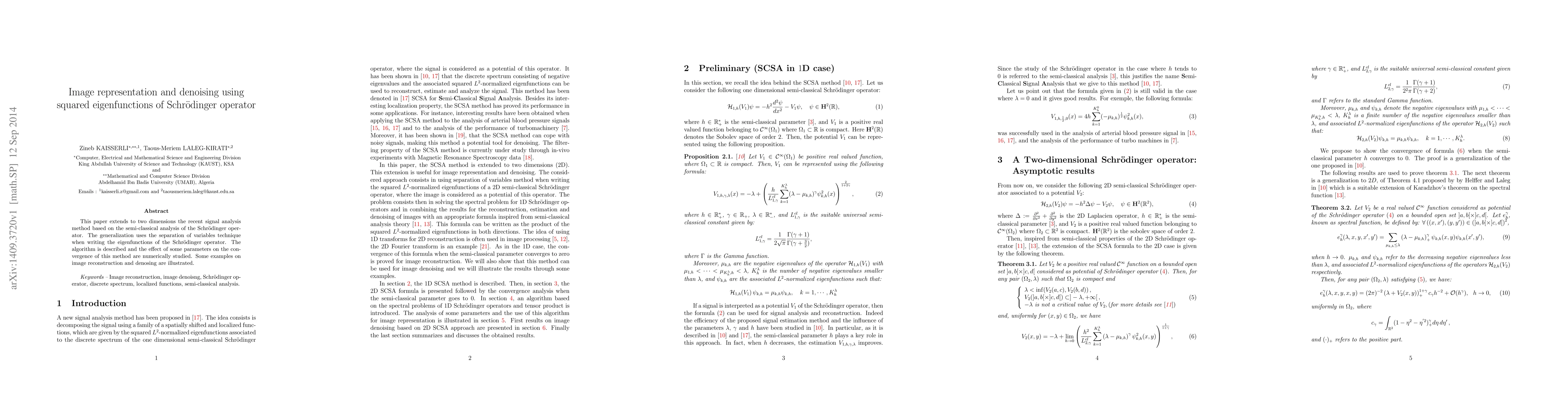 This paper extends to two dimensions the recent signal analysis method based on the semi-classical analysis of the Schrodinger operator. The generalization uses the separation of variables technique when writing the eigenfunctions of the Schrodinger operator. The algorithm is described and the effect of some parameters on the convergence of this method are numerically studied. Some examples on image reconstruction and denosing are illustrated.