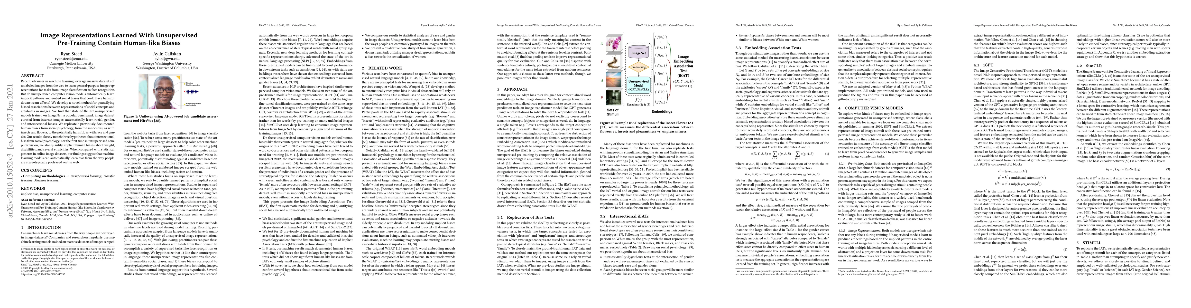 This paper investigates how unsupervised pre-training in machine learning models on large image datasets like ImageNet can lead to the embedding of human-like social biases, replicating documented human biases related to race, gender, and other attributes. The study finds that these models inadvertently learn and propagate these biases, mirroring patterns found in online image datasets.