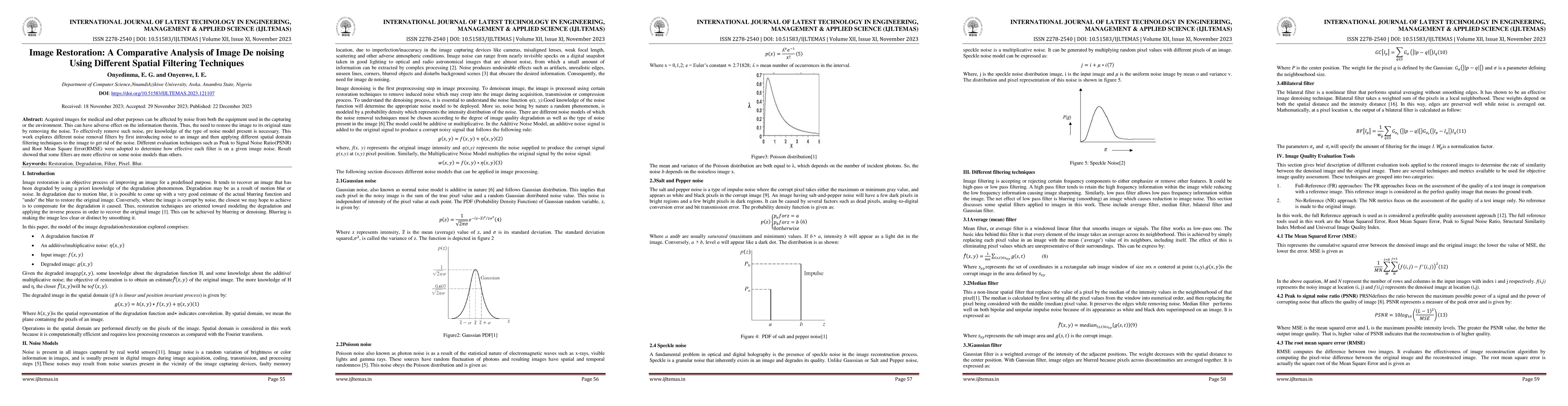 Acquired images for medical and other purposes can be affected by noise from both the equipment used in the capturing or the environment. This can have adverse effect on the information therein. Thus, the need to restore the image to its original state by removing the noise. To effectively remove such noise, pre knowledge of the type of noise model present is necessary. This work explores different noise removal filters by first introducing noise to an image and then applying different spatial domain filtering techniques to the image to get rid of the noise. Different evaluation techniques such as Peak to Signal Noise Ratio(PSNR) and Root Mean Square Error(RMSE) were adopted to determine how effective each filter is on a given image noise. Result showed that some filters are more effective on some noise models than others.