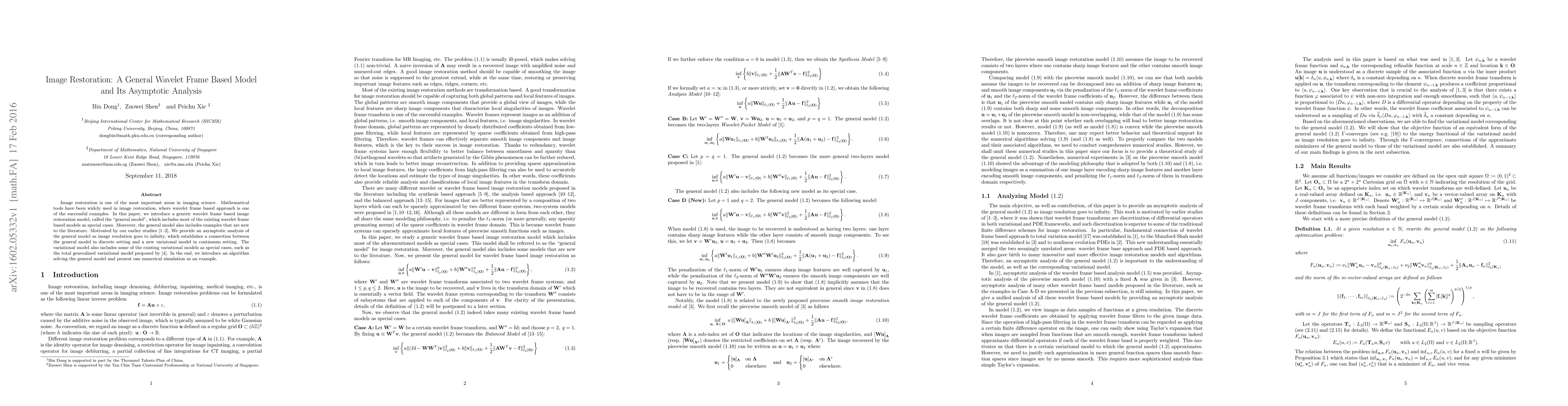 This paper introduces a generic wavelet frame based image restoration model, encompassing existing models and presenting new examples. It provides an asymptotic analysis linking the discrete model to a continuum variational model, and concludes with an algorithm for solving the general model and a numerical simulation.
