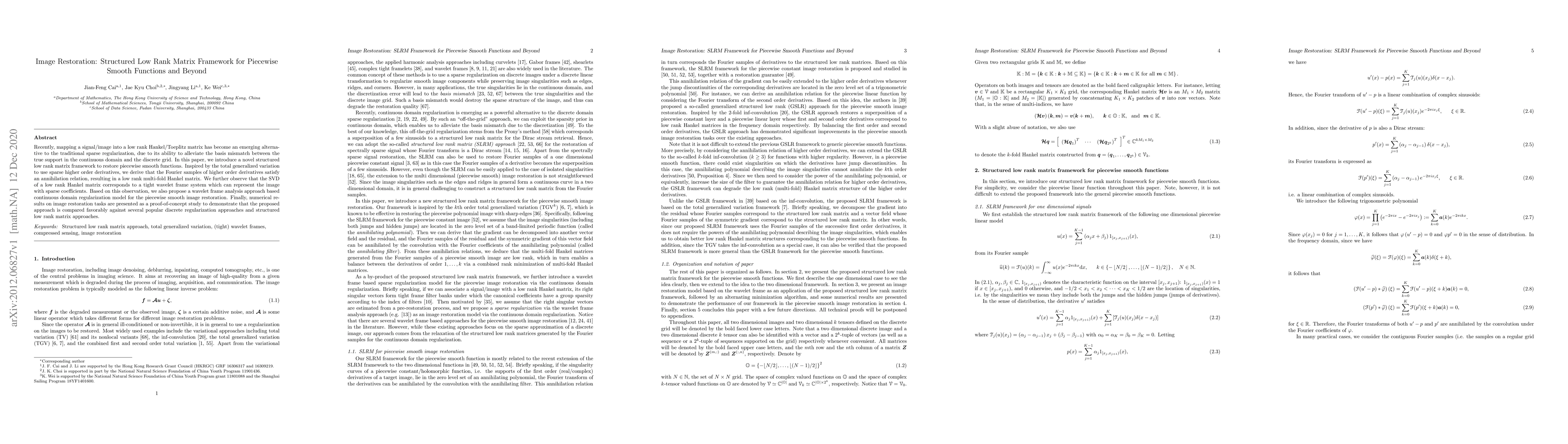 This paper proposes a structured low rank matrix framework for restoring piecewise smooth functions, leveraging low rank Hankel matrices and wavelet frame systems to overcome basis mismatch issues. The method is shown to outperform traditional sparse regularization and other structured low rank approaches in numerical image restoration tasks.