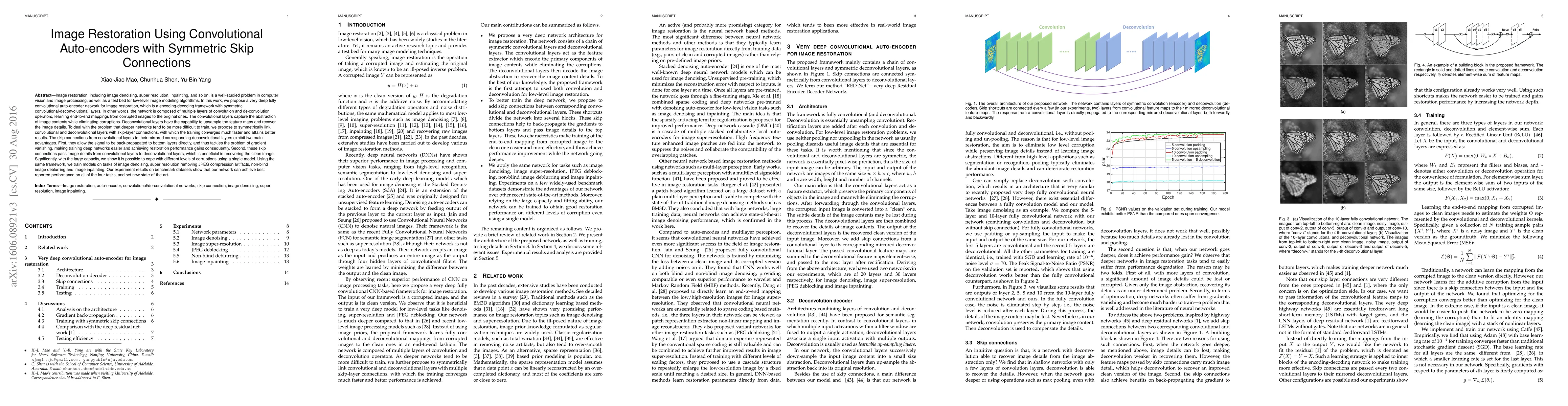 This paper proposes a deep convolutional auto-encoder with symmetric skip connections for image restoration tasks like denoising and super resolution. The network uses convolutional layers to abstract image contents and deconvolutional layers to recover details, with skip connections aiding faster and more effective training.