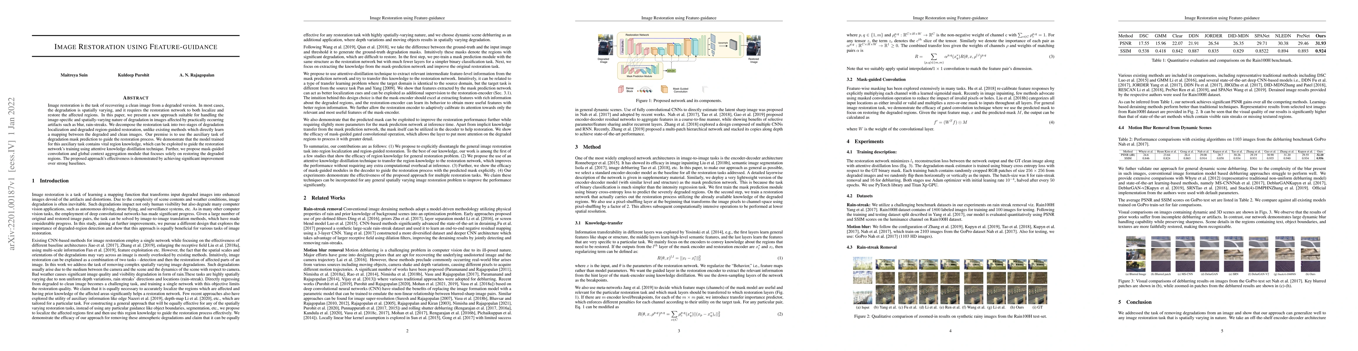 Image restoration is the task of recovering a clean image from a degraded version. In most cases, the degradation is spatially varying, and it requires the restoration network to both localize and restore the affected regions. In this paper, we present a new approach suitable for handling the image-specific and spatially-varying nature of degradation in images affected by practically occurring artifacts such as blur, rain-streaks. We decompose the restoration task into two stages of degradation localization and degraded region-guided restoration, unlike existing methods which directly learn a mapping between the degraded and clean images. Our premise is to use the auxiliary task of degradation mask prediction to guide the restoration process. We demonstrate that the model trained for this auxiliary task contains vital region knowledge, which can be exploited to guide the restoration network's training using attentive knowledge distillation technique. Further, we propose mask-guided convolution and global context aggregation module that focuses solely on restoring the degraded regions. The proposed approach's effectiveness is demonstrated by achieving significant improvement over strong baselines.