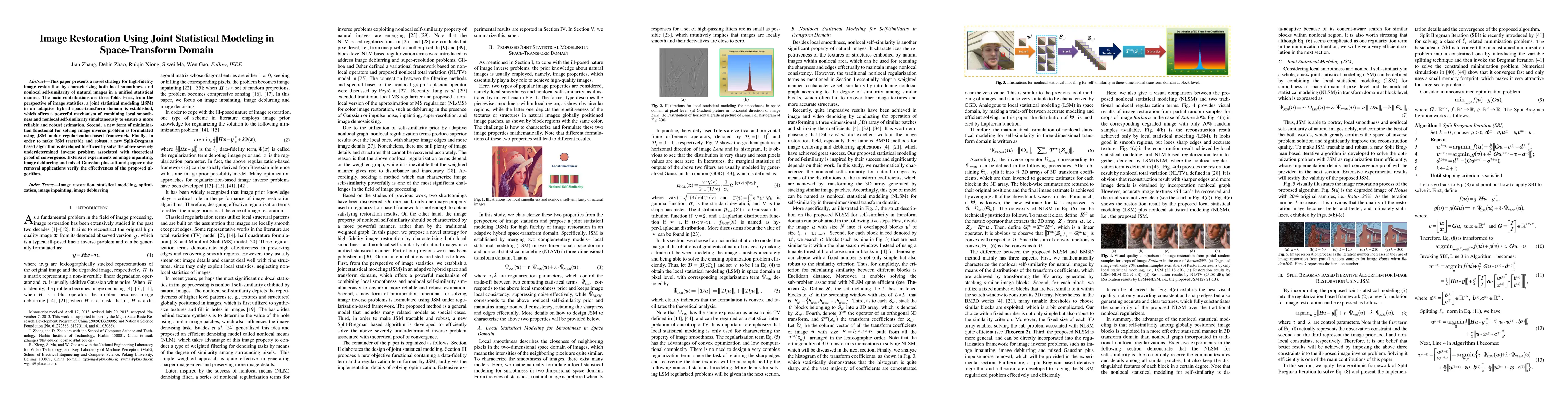 This paper introduces a new method for high-quality image restoration, merging local smoothness and nonlocal self-similarity of images in a unified statistical model. It proposes a joint statistical modeling in an adaptable space-transform domain, a novel minimization functional, and a Split-Bregman algorithm for solving image inverse problems, demonstrated effectively through various restoration tasks.