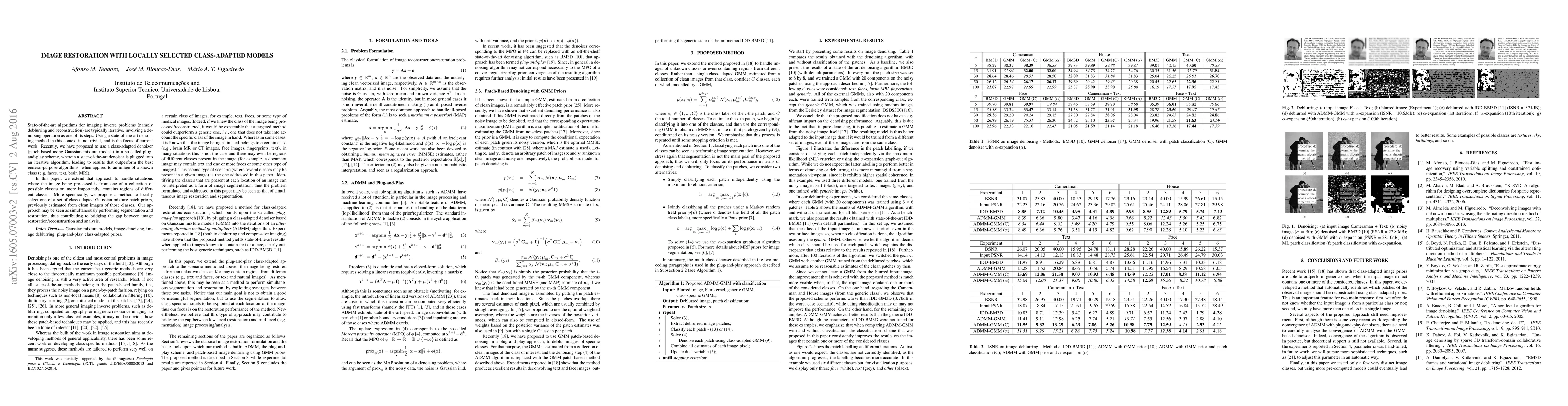 State-of-the-art algorithms for imaging inverse problems (namely deblurring and reconstruction) are typically iterative, involving a denoising operation as one of its steps. Using a state-of-the-art denoising method in this context is not trivial, and is the focus of current work. Recently, we have proposed to use a class-adapted denoiser (patch-based using Gaussian mixture models) in a so-called plug-and-play scheme, wherein a state-of-the-art denoiser is plugged into an iterative algorithm, leading to results that outperform the best general-purpose algorithms, when applied to an image of a known class (e.g. faces, text, brain MRI). In this paper, we extend that approach to handle situations where the image being processed is from one of a collection of possible classes or, more importantly, contains regions of different classes. More specifically, we propose a method to locally select one of a set of class-adapted Gaussian mixture patch priors, previously estimated from clean images of those classes. Our approach may be seen as simultaneously performing segmentation and restoration, thus contributing to bridging the gap between image restoration/reconstruction and analysis.