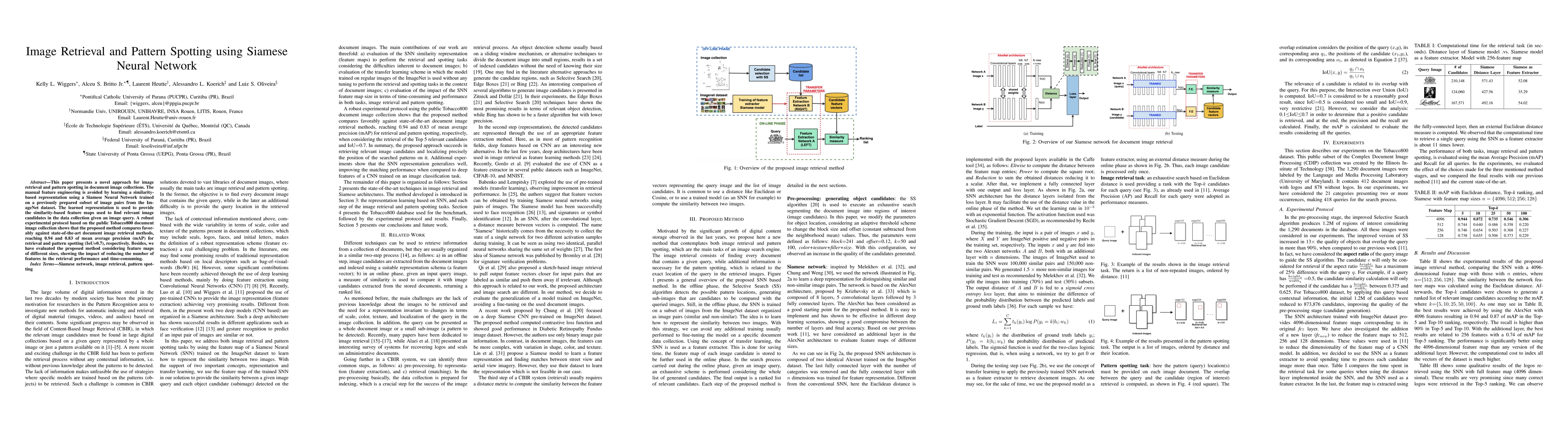 This paper introduces a Siamese Neural Network for image retrieval and pattern spotting in document images, eliminating manual feature engineering. The method achieves superior performance compared to state-of-the-art techniques, as demonstrated by high mean average precision scores on the Tobacco800 dataset.