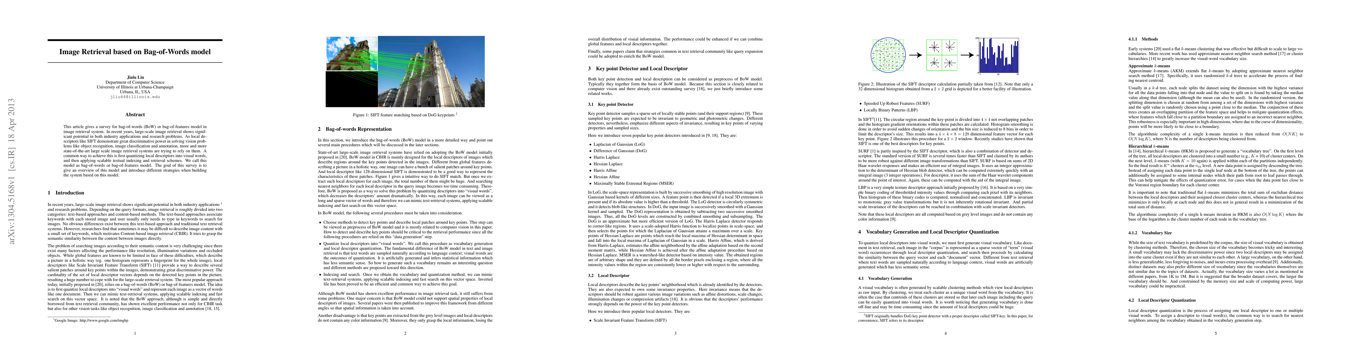 This article gives a survey for bag-of-words (BoW) or bag-of-features model in image retrieval system. In recent years, large-scale image retrieval shows significant potential in both industry applications and research problems. As local descriptors like SIFT demonstrate great discriminative power in solving vision problems like object recognition, image classification and annotation, more and more state-of-the-art large scale image retrieval systems are trying to rely on them. A common way to achieve this is first quantizing local descriptors into visual words, and then applying scalable textual indexing and retrieval schemes. We call this model as bag-of-words or bag-of-features model. The goal of this survey is to give an overview of this model and introduce different strategies when building the system based on this model.