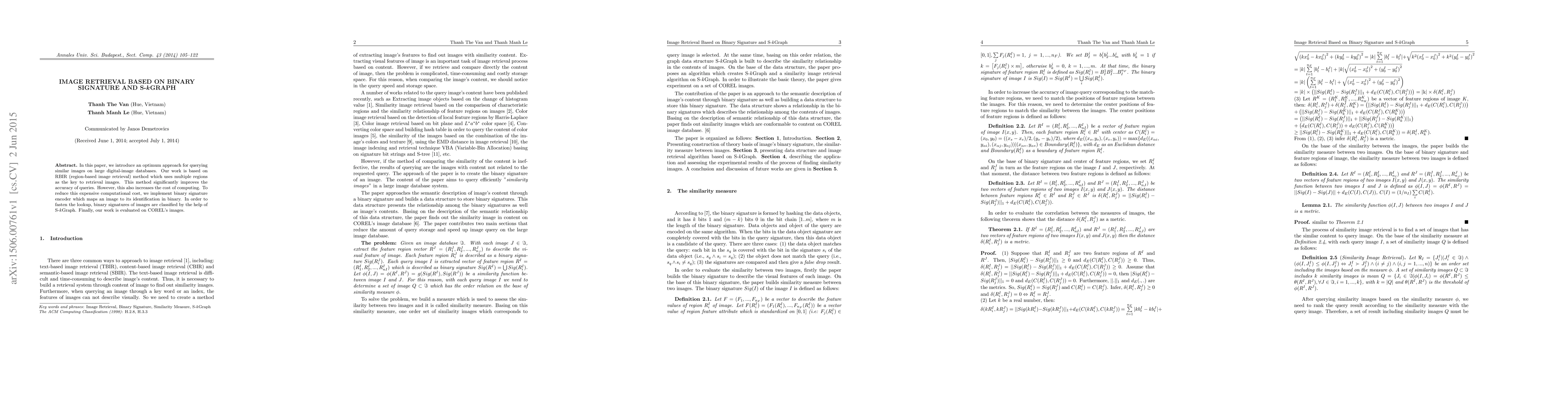 In this paper, we introduce an optimum approach for querying similar images on large digital-image databases. Our work is based on RBIR (region-based image retrieval) method which uses multiple regions as the key to retrieval images. This method significantly improves the accuracy of queries. However, this also increases the cost of computing. To reduce this expensive computational cost, we implement binary signature encoder which maps an image to its identification in binary. In order to fasten the lookup, binary signatures of images are classified by the help of S-kGraph. Finally, our work is evaluated on COREL's images.