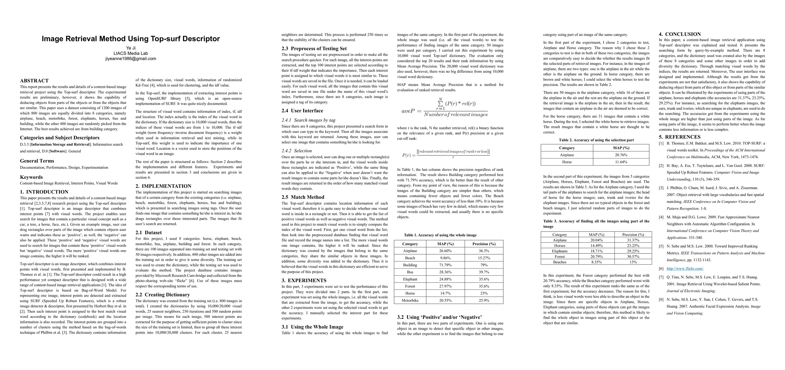 This report presents the results and details of a content-based image retrieval project using the Top-surf descriptor. The experimental results are preliminary, however, it shows the capability of deducing objects from parts of the objects or from the objects that are similar. This paper uses a dataset consisting of 1200 images of which 800 images are equally divided into 8 categories, namely airplane, beach, motorbike, forest, elephants, horses, bus and building, while the other 400 images are randomly picked from the Internet. The best results achieved are from building category.