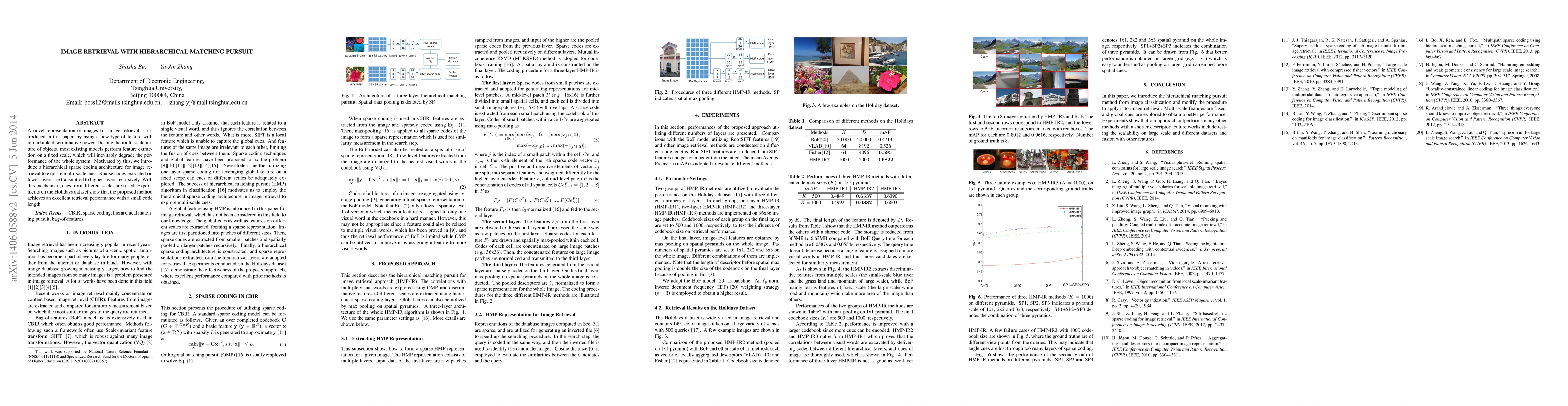This paper presents a hierarchical sparse coding architecture for image retrieval that leverages multi-scale cues to improve performance. The method fuses discriminative features extracted at different scales, achieving superior retrieval results on the Holidays dataset with minimal code length.