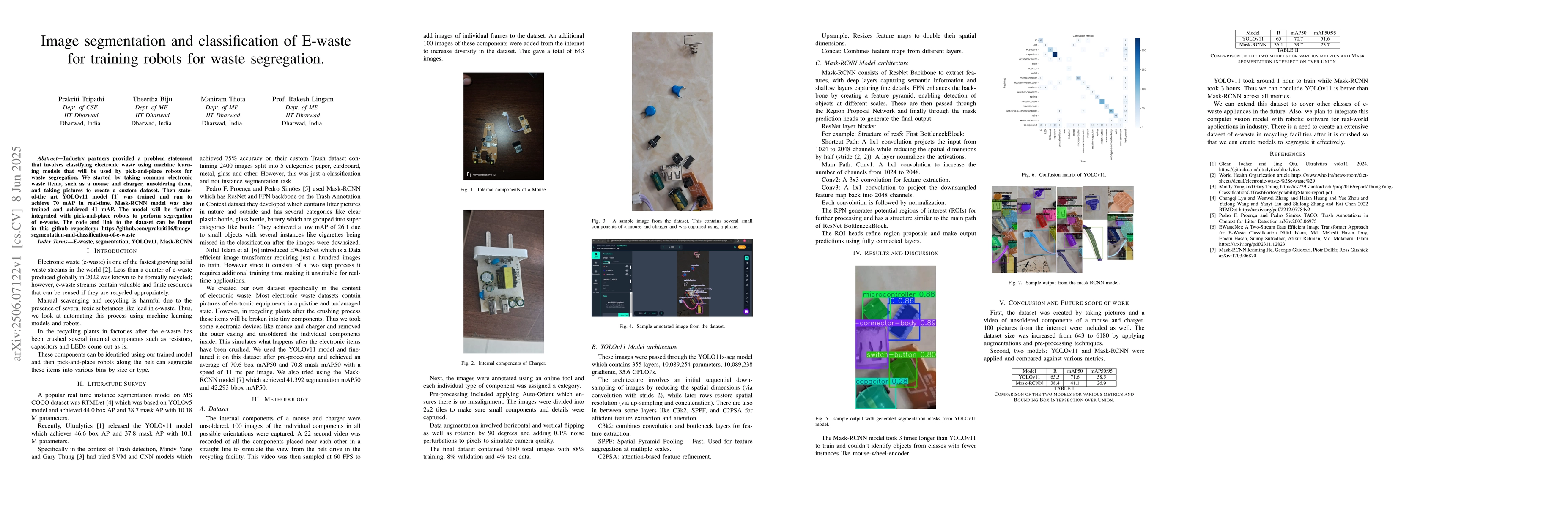 Industry partners provided a problem statement that involves classifying electronic waste using machine learning models that will be used by pick-and-place robots for waste segregation. We started by taking common electronic waste items, such as a mouse and charger, unsoldering them, and taking pictures to create a custom dataset. Then state-of-the art YOLOv11 model was trained and run to achieve 70 mAP in real-time. Mask-RCNN model was also trained and achieved 41 mAP. The model will be further integrated with pick-and-place robots to perform segregation of e-waste.