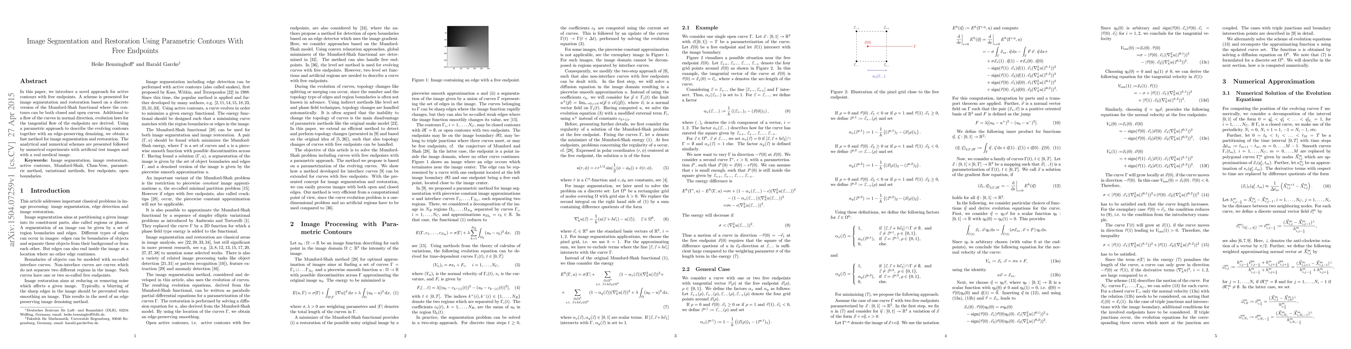 This paper proposes a novel method for image segmentation and restoration using parametric contours with free endpoints, based on a discrete Mumford-Shah functional. The approach includes evolution laws for the tangential flow of the endpoints, enabling both closed and open curves, and is validated with both artificial and real medical images.