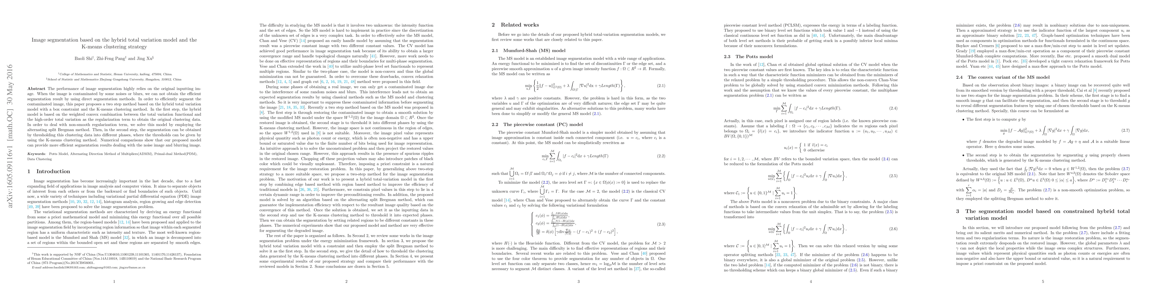 This paper proposes a two-step method for image segmentation using a hybrid total variation model combined with K-means clustering to efficiently segment contaminated images. The method employs an alternating split Bregman method to solve the regularization problem and uses K-means clustering for thresholding to achieve better segmentation results.