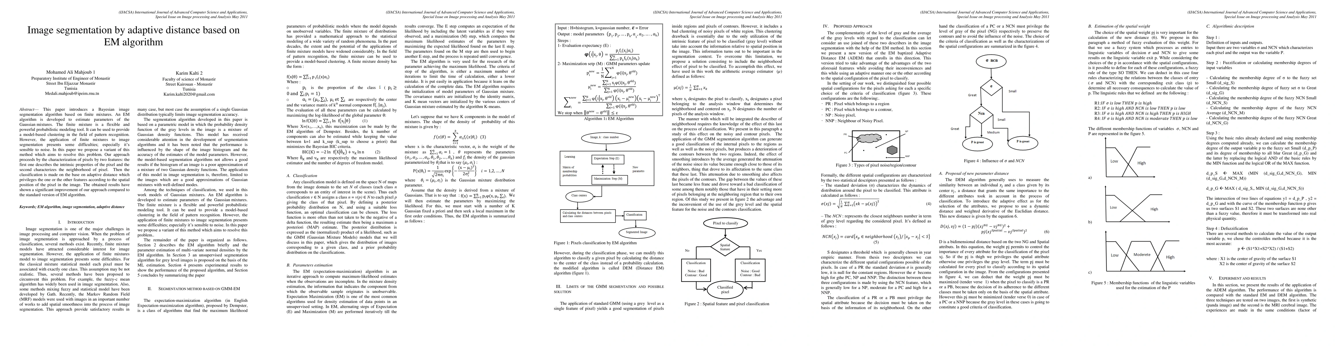 A new image segmentation algorithm using adaptive distance based on EM algorithm improves results over a traditional version by considering pixel features and neighborhood characteristics.