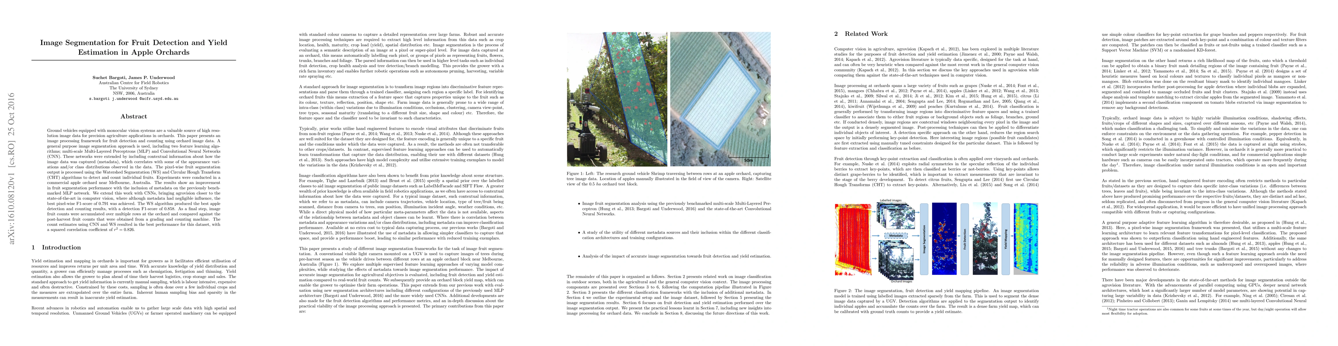 This paper develops an image processing framework for fruit detection and yield estimation in apple orchards using ground vehicles equipped with monocular vision systems. It employs multi-scale MLP and CNN networks enhanced with metadata to achieve pixel-wise fruit segmentation, followed by Watershed Segmentation and Circular Hough Transform for fruit detection and counting, achieving a high correlation ($r^2=0.826$) with post-harvest counts.
